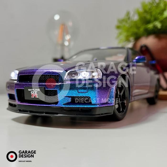 Diecast Mobil Miniatur JDM Car R34 Nissan Skyline GTR R34 Diecast Skala 1:24 Fast and Furious Hadiah Lampu - Ungu 1:24
