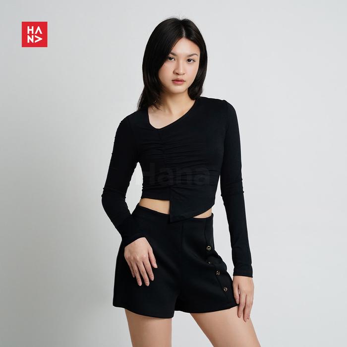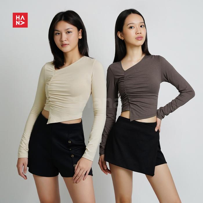 Hana Fashion - Summer Top/Crop Top Long Sleeve Wanita/ Kaos Panjang Kerut - TS611 Atasan Basic - Black S