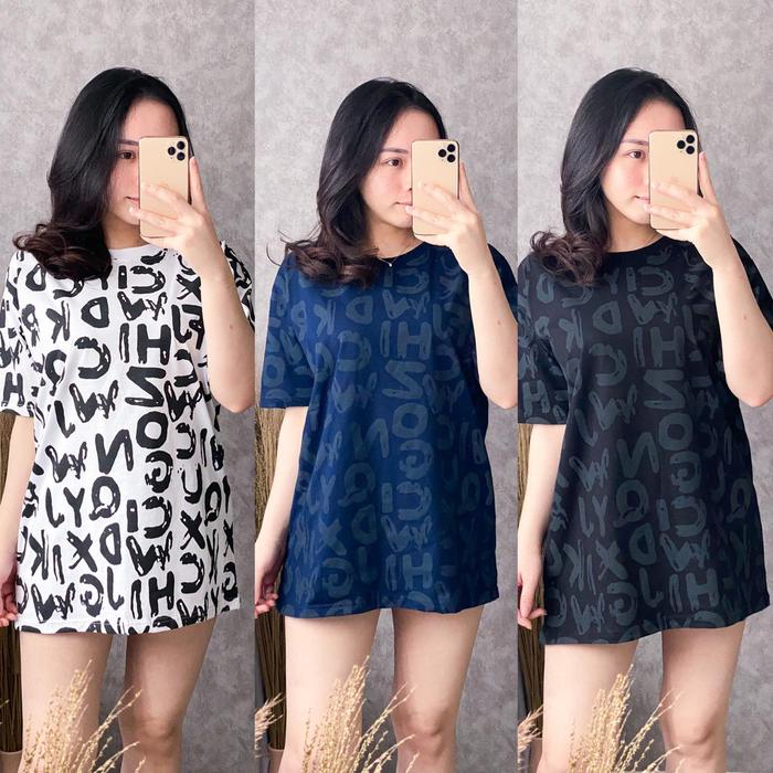 Kaos Oversized Wanita Bahan Cotton Combed 30s Motif Huruf Full Print Panjang Oversize - Putih