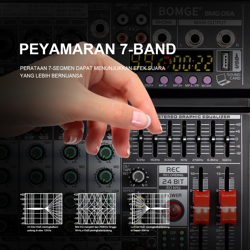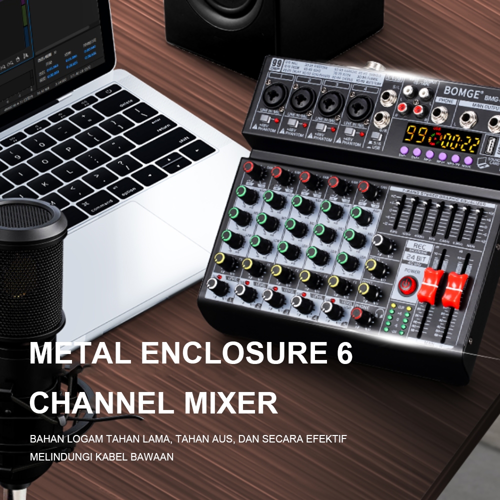 BOMGE 06A Audio Mixer 4/6 Channel Soundcard 99DSP USB/MP3 Echo Delay Effect, Input 48V Phantom Power
