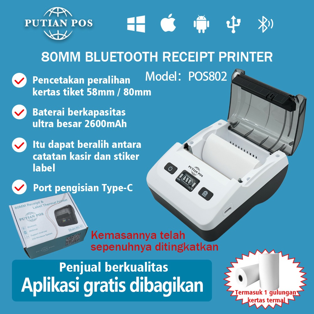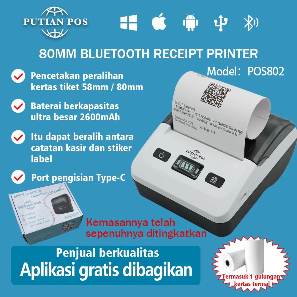 PUTIAN POS Portable Mini 80mm Bluetooth Thermal Printer PUTIAN802Label Sticker Printer denganbaterai
