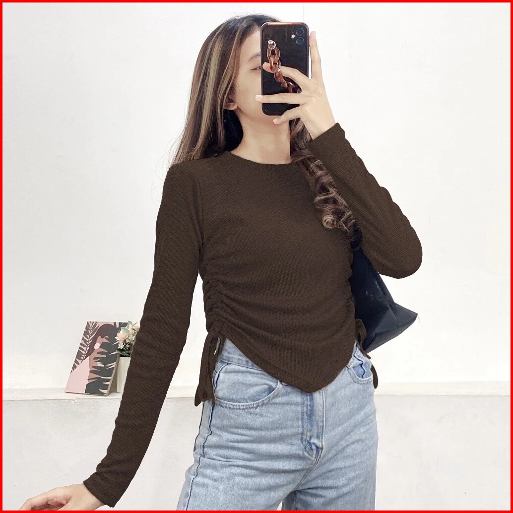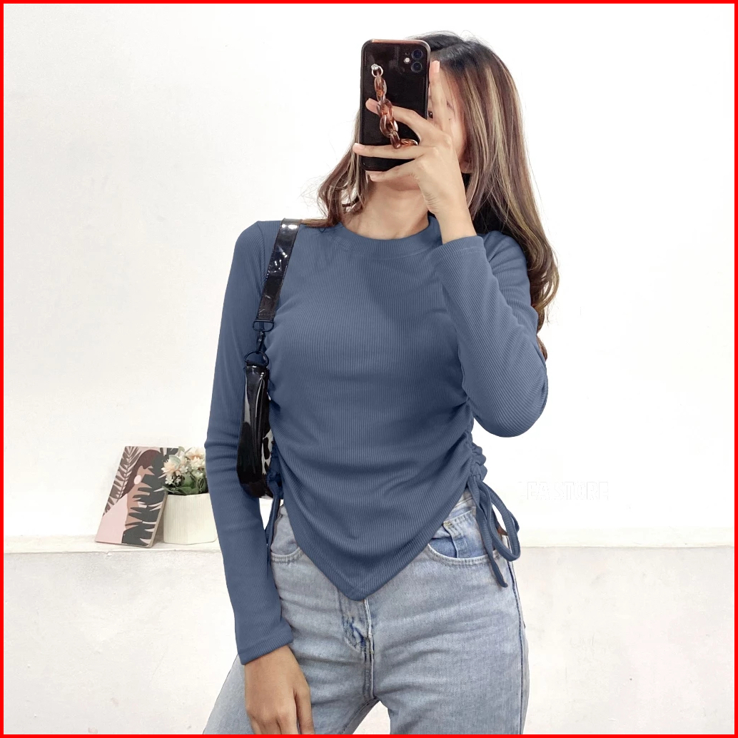 Valen Top Blouse Knit Wanita Kekinian Atasan Model Serut Samping Lengan Panjang Korean