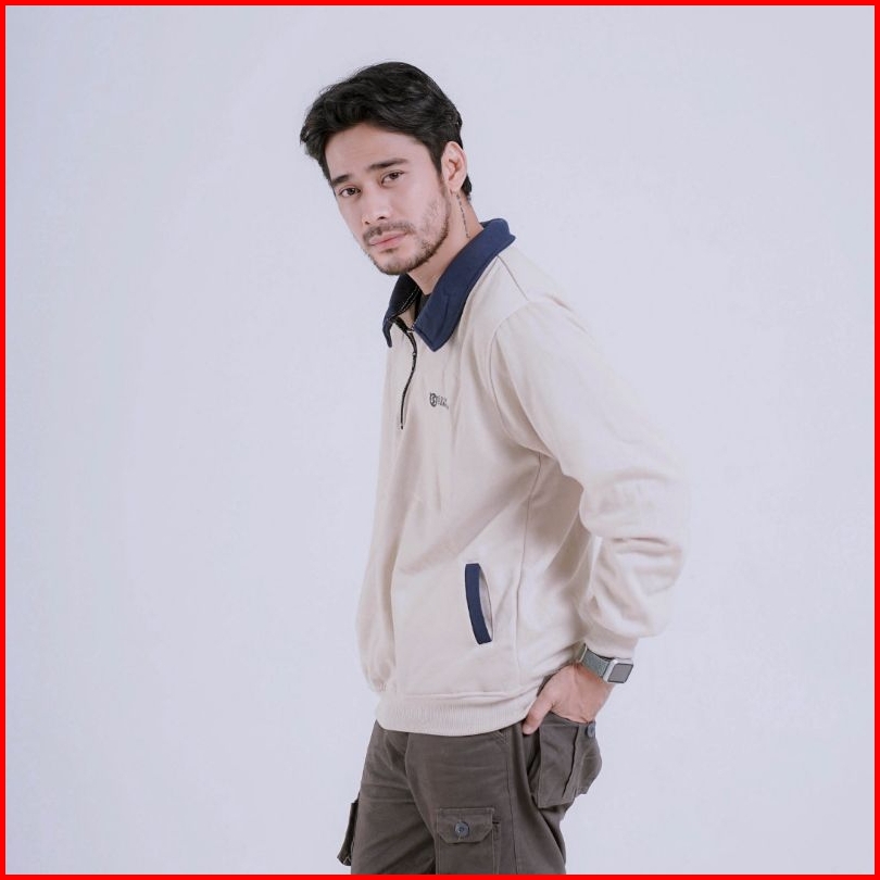 Egtn Somnium Sweater Rugby Kerah Zipper Warna Cream Beggie Kombinasi Navy Halfzip Model Vintage Pria Wanita