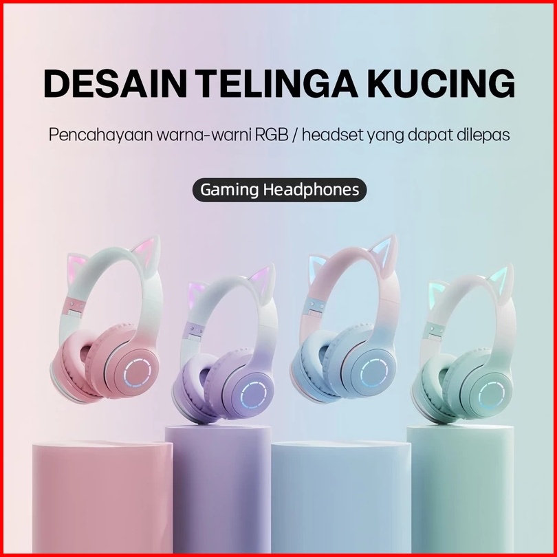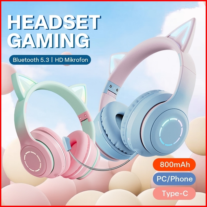 Headphone Nirkabel Telinga Kucing Dengan Bluetooth 5.3 Untuk Bermain Game Komputer Dan Olahraga Dengan Pencahayaan Rgb H