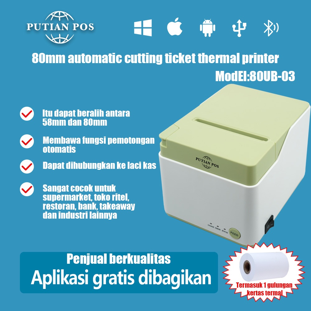 PUTIAN POS Printer Termal Bluetooth Desktop 58/80mm 80UB-03dengan Pemotongan Otomatis, Ethernet, USB