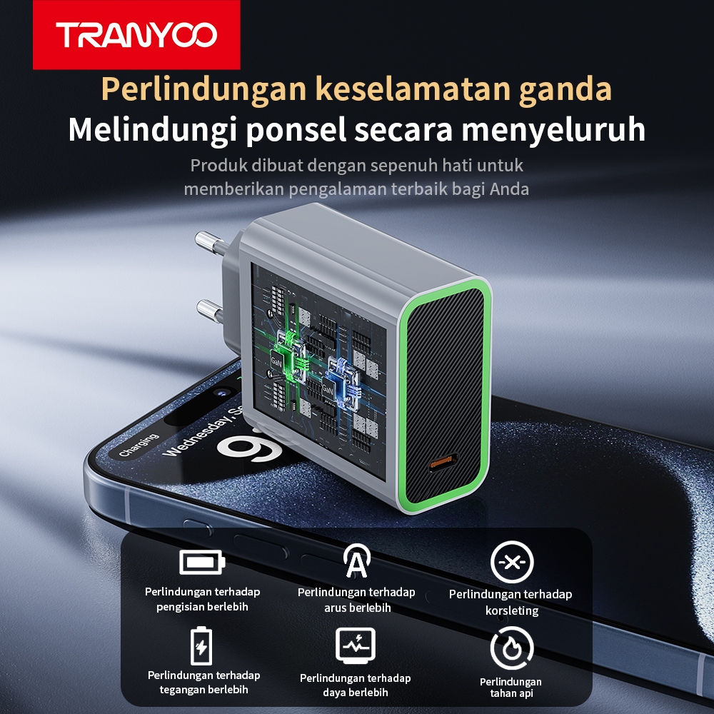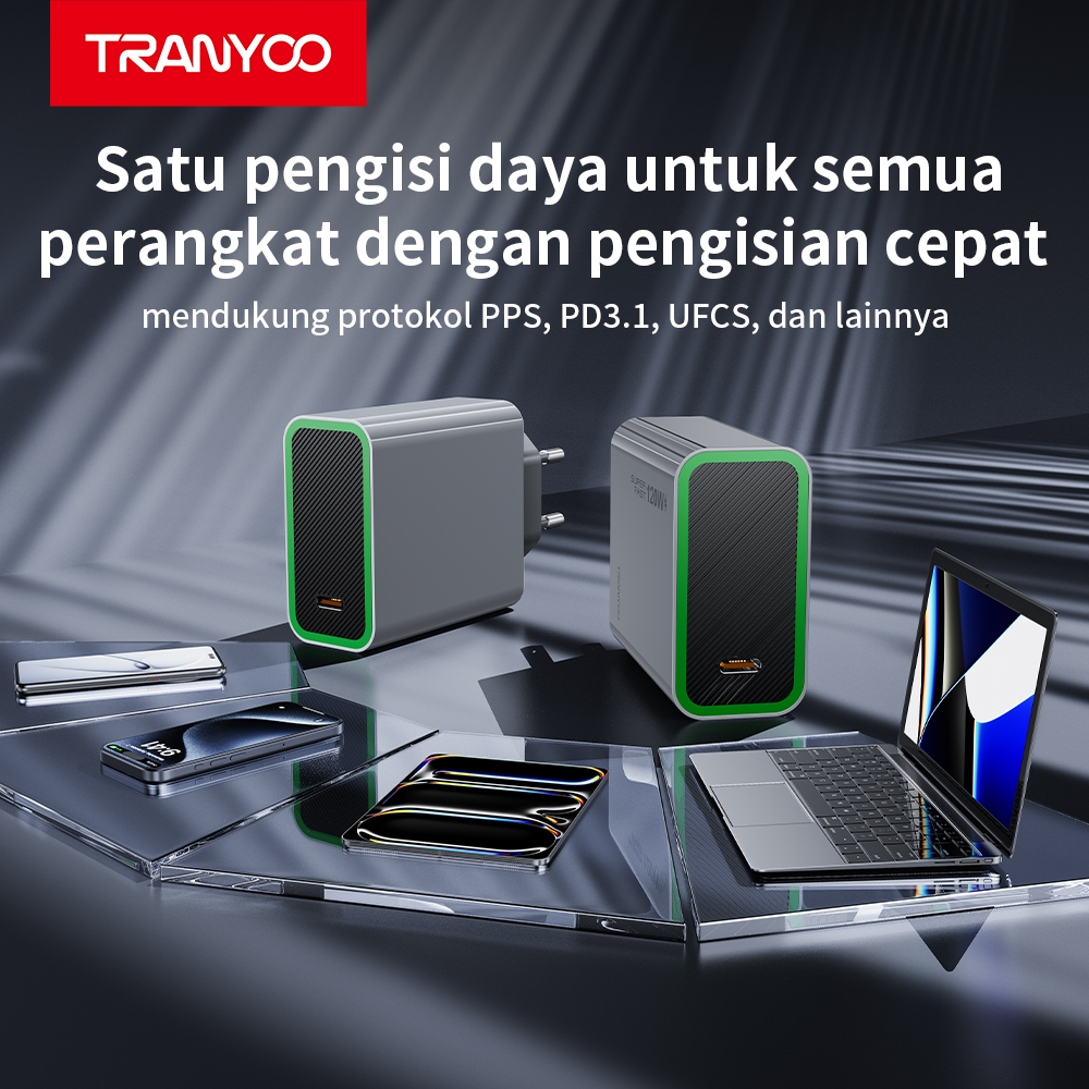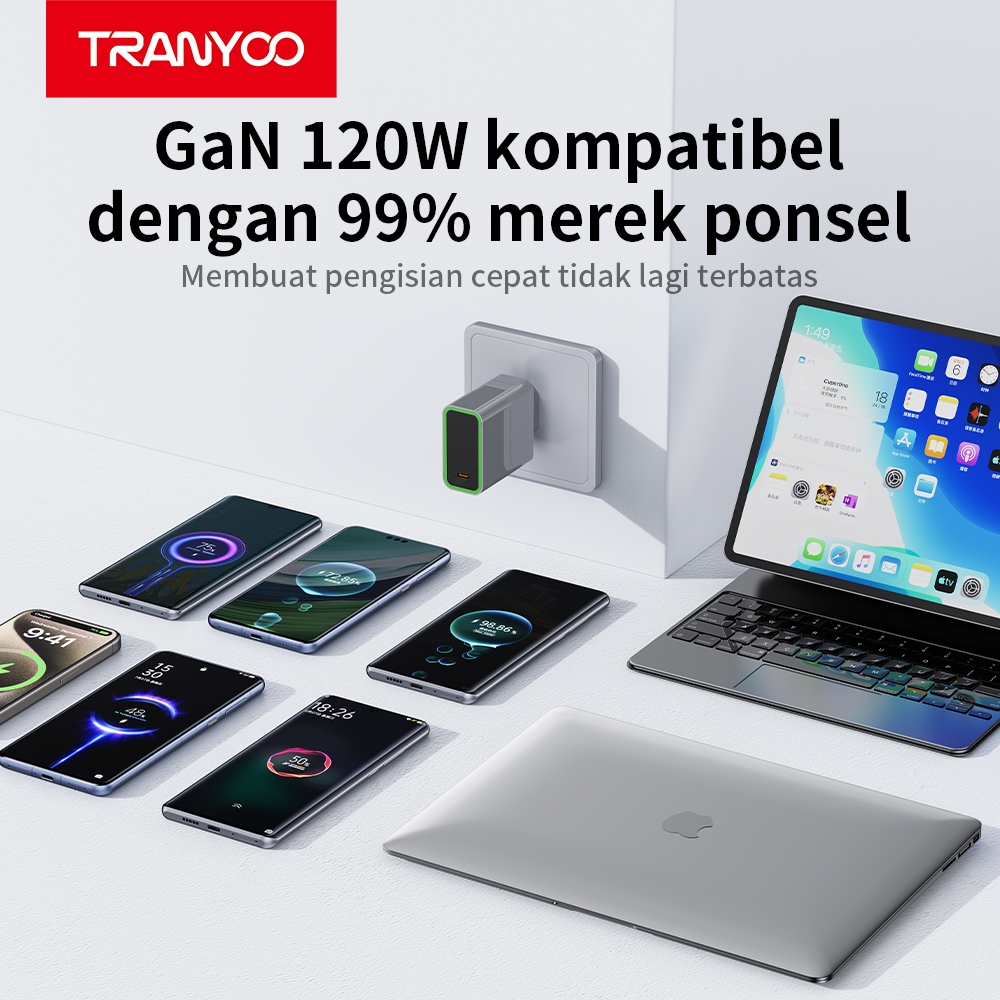 TRANYOO Charger HP GaN 120W Kabel Data Type-C Adaptor untuk Handphones Quick Charger Fast Charging PPS Support Cocok unt