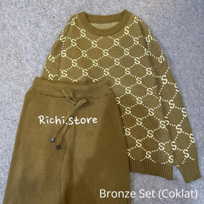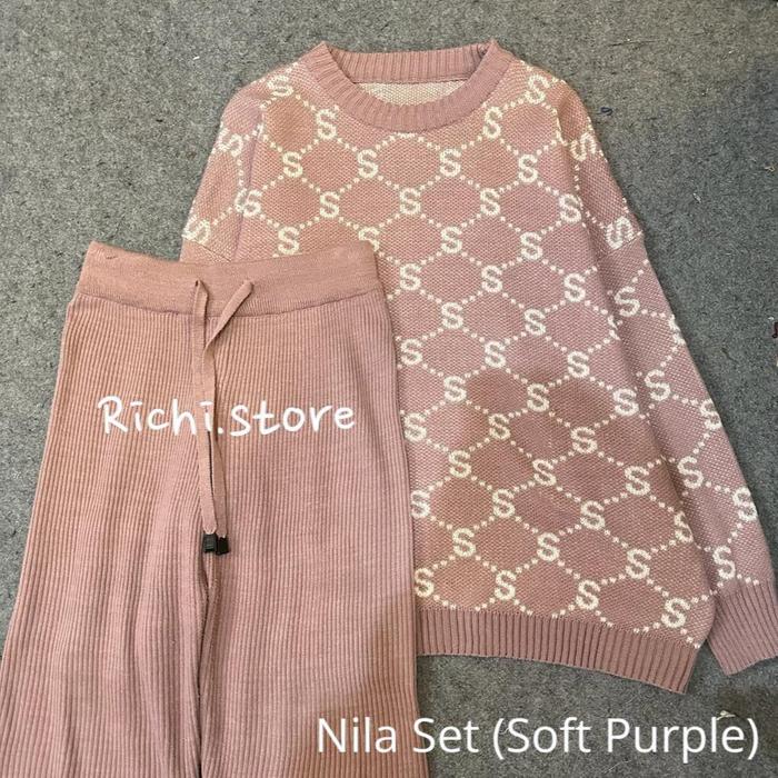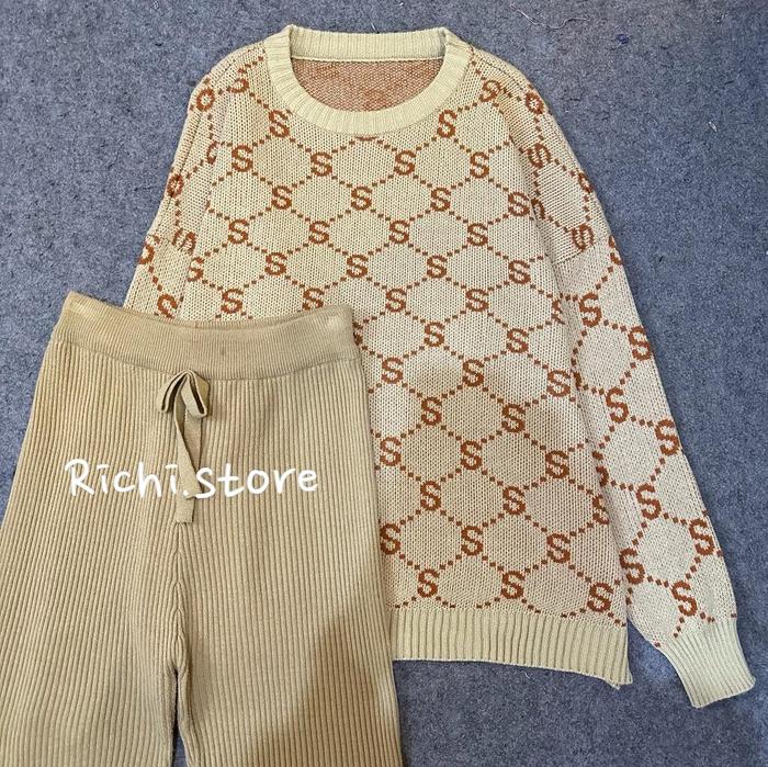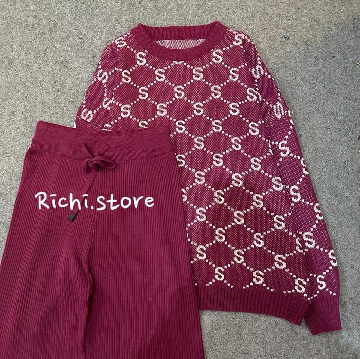 Syla Oversize - Setelan Rajut Wanita Motif Huruf S Baju Celana - Magenta, Atasan+Celana Normal