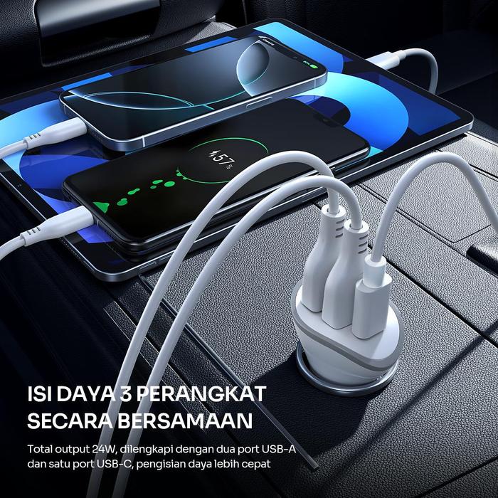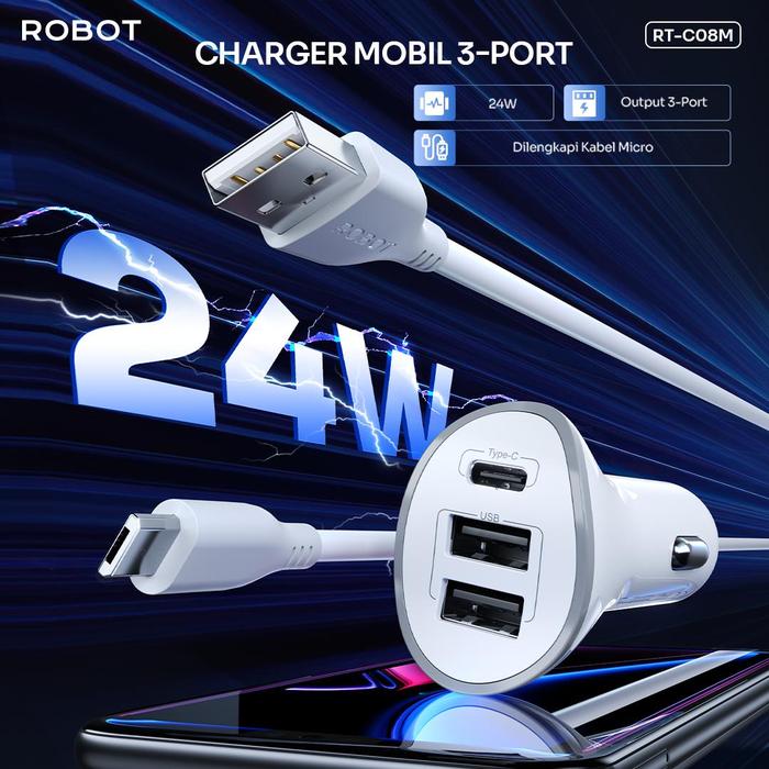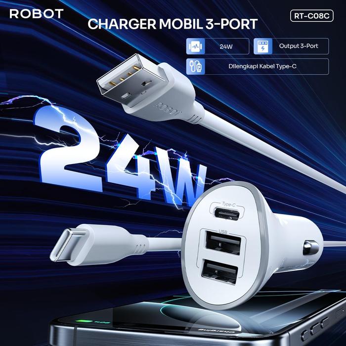 Robot Rt-C08 Car Charger Colokan Mobil - Car Charger Rt-C08C/Rt-C08M 3 Port 24W Adapter Charger Mobil Fast Charging Type