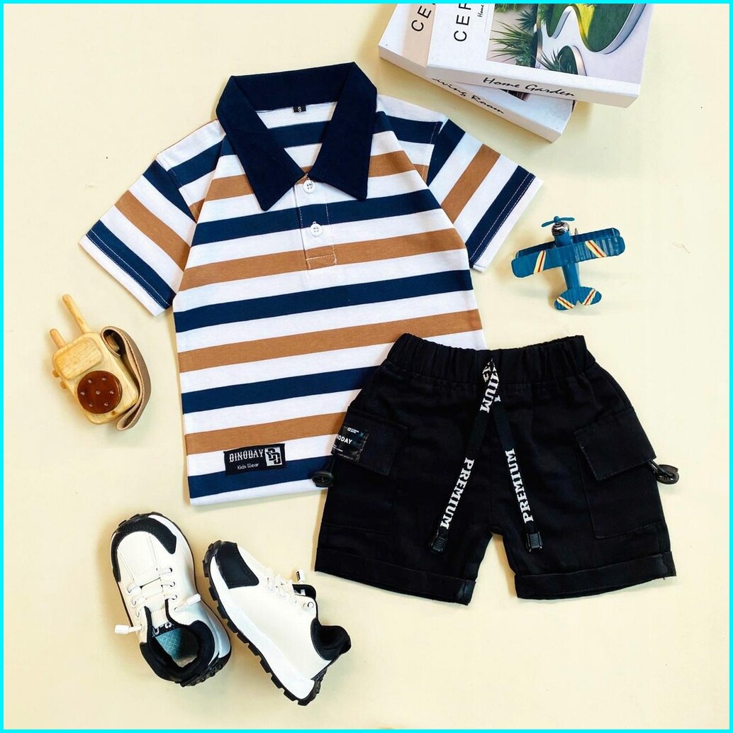 Estishop X Dinoday Setelan Baju Anak Laki Laki Perempuan Kerah Salur Celana Jeans Pendek 1-7 Tahun