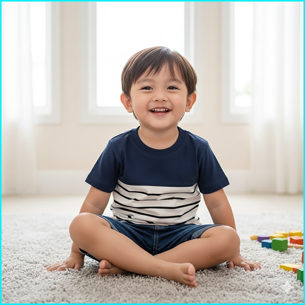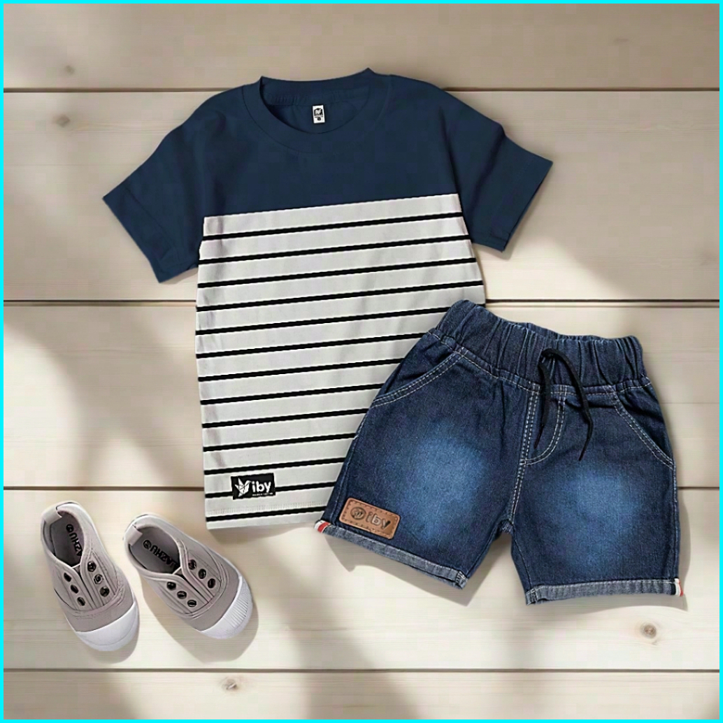 Almont Garis Kaos Anak Laki-laki Celana Jeans Pendek Outfit Kasual