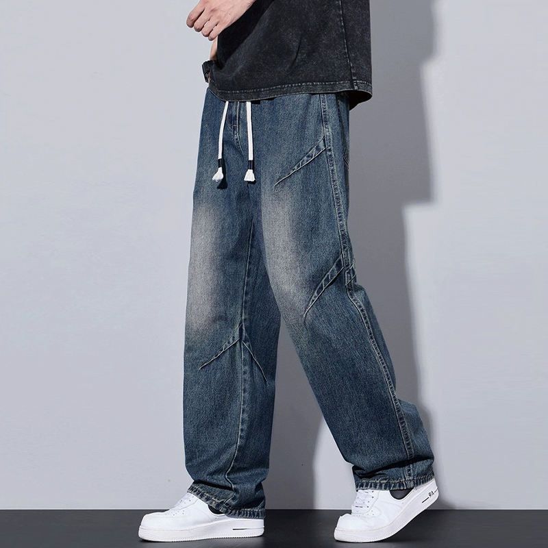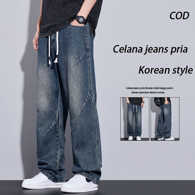 Celana jeans Pria panjang biru tua Korean style baggy pants denim dewasa cowok longgar casual jens gombrong straight cut jins