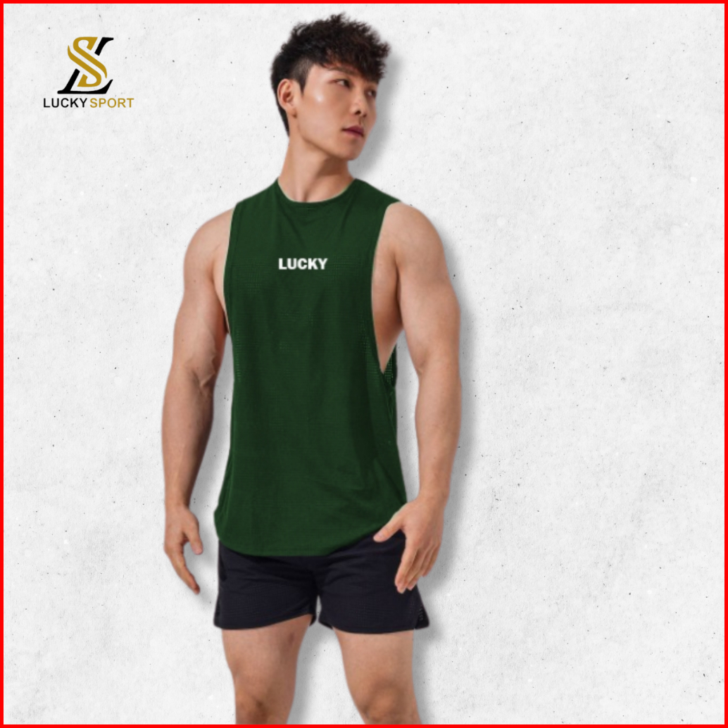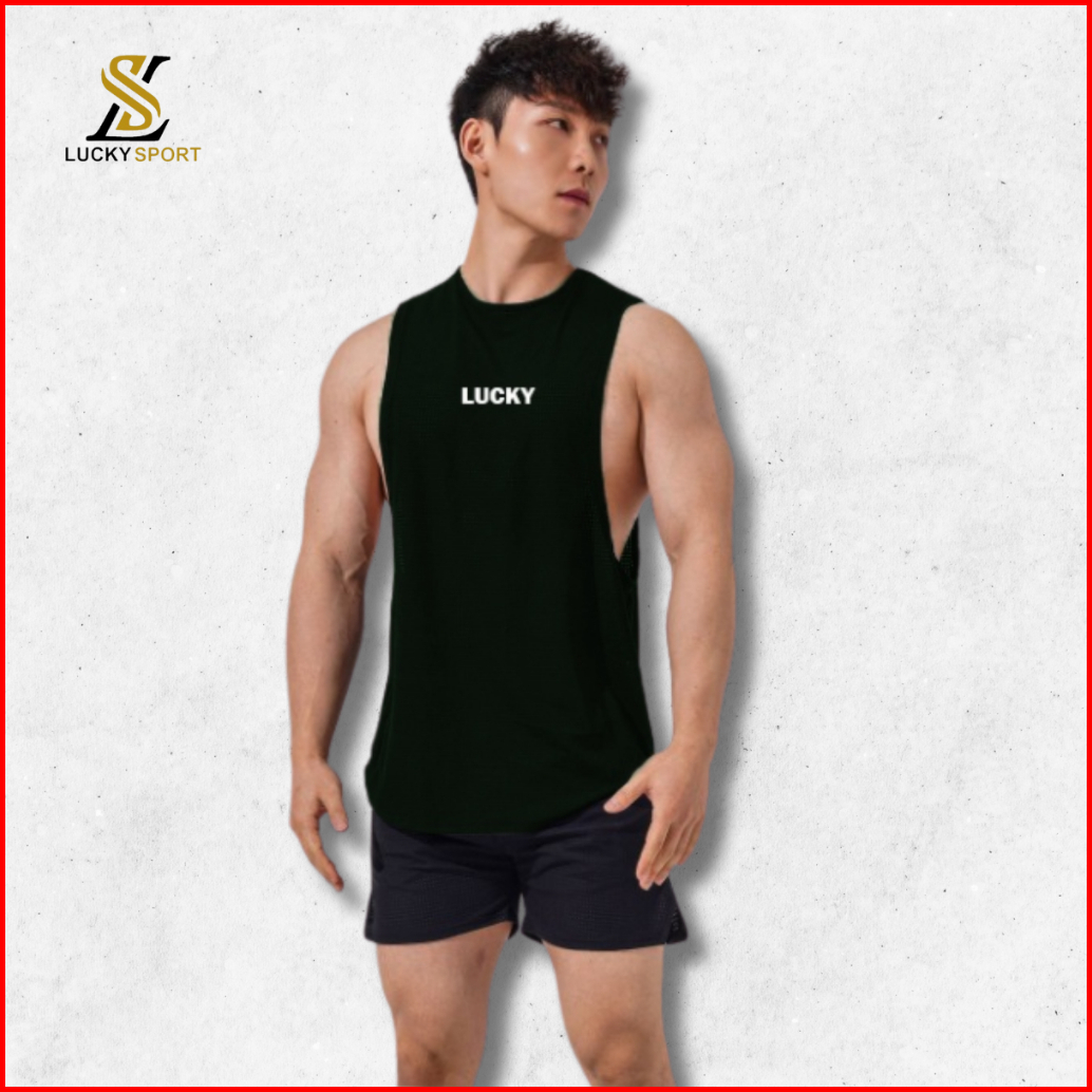 Singlet Pria Gym Fitness Olahraga Polos Low Cut Deep Cut Tank Top Over Size Sporty Lucky