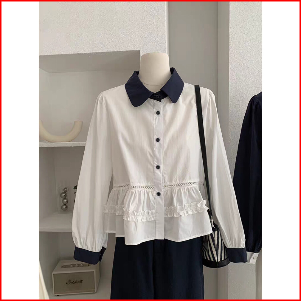 Kemeja Wanita Polos Dengan Detil Kerah Dan Lengan Balon Kombinasi Warna Atasan Lengan Panjang Kasual Pakaian Wanita Modi