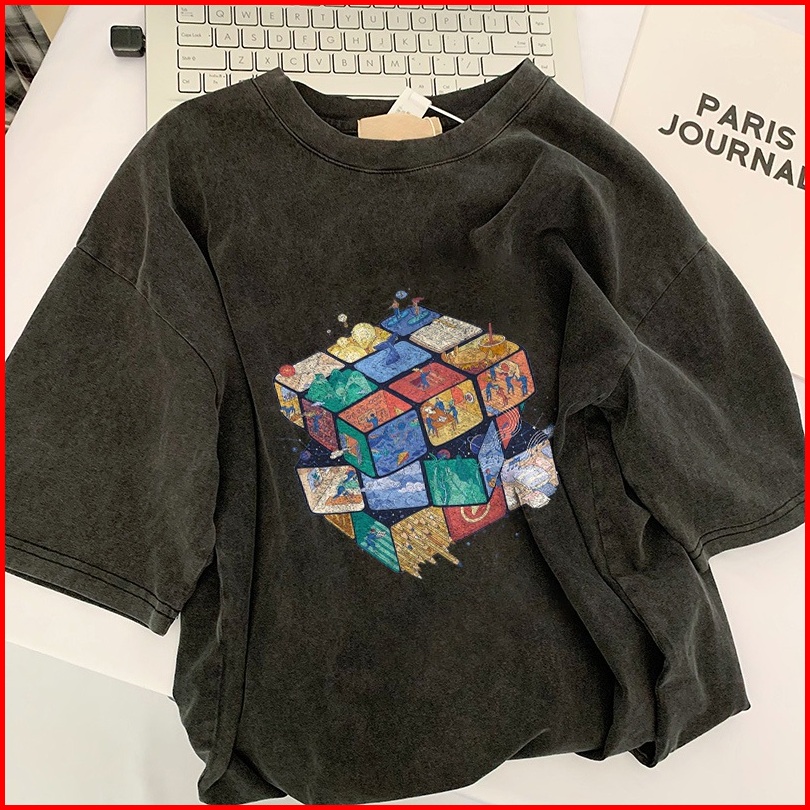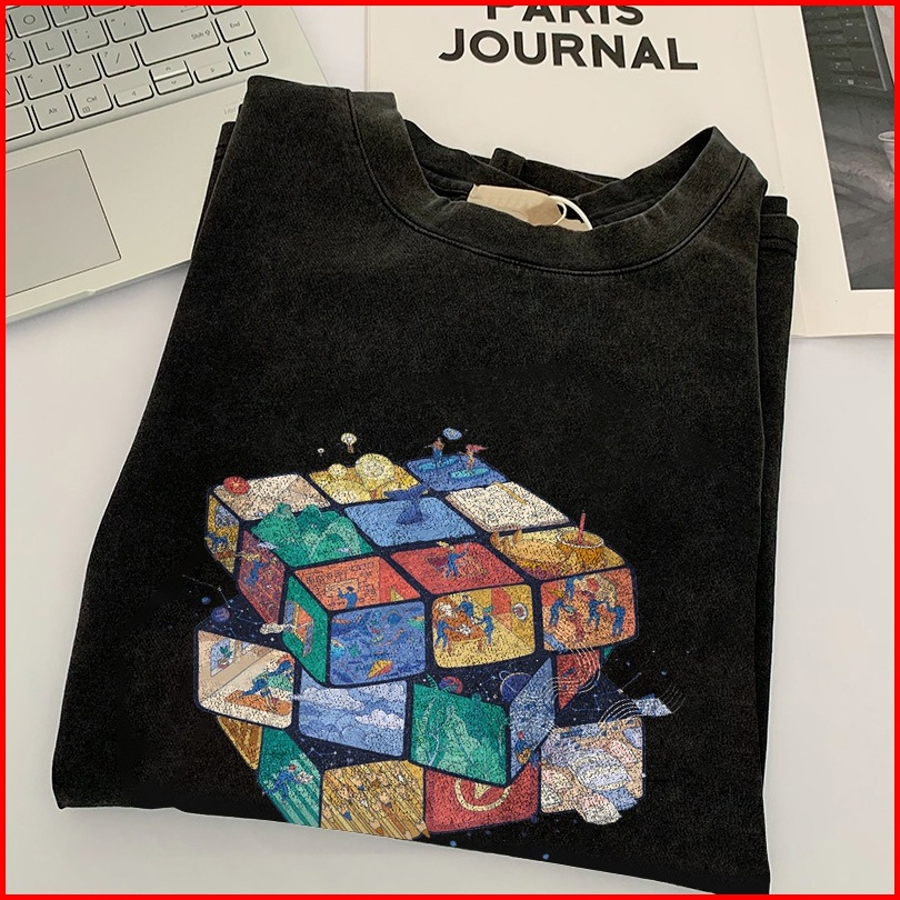 Fastfash Kaos Lengan Pendek Pakaian Pria Dan Wanita Oversize Vintage Cool Rubik S Cube Bergaya Netral - Baju Kaos Washed
