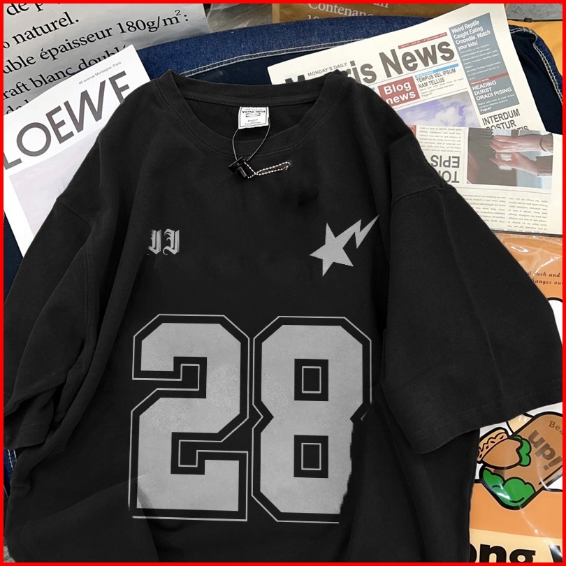 Fastfash Baju Kaos Pria Dan Wanita Lengan Pendek Oversize Vintage No.28 Dicetak Putih T Shirt Pria Atasan Washed Hitam C