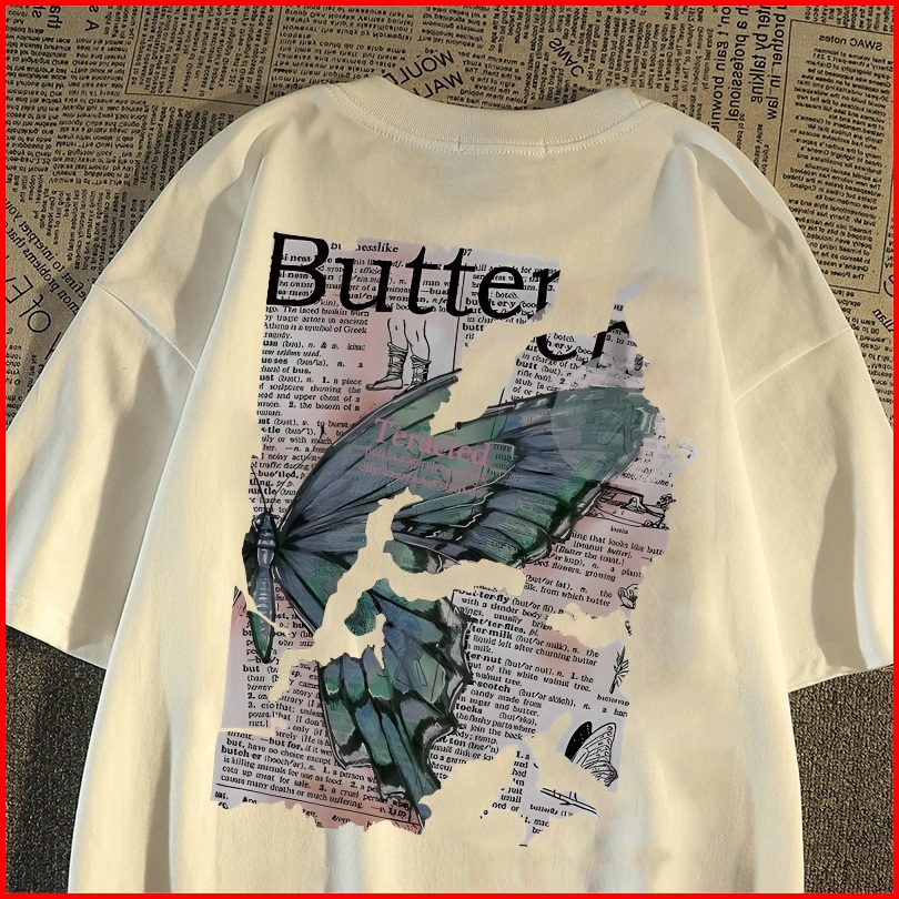 Fastfash Kaos Pakaian Pria Dan Wanita Oversize Kupu-kupu Koran Robek Baju Kaos Bergaya Netral T-shirt