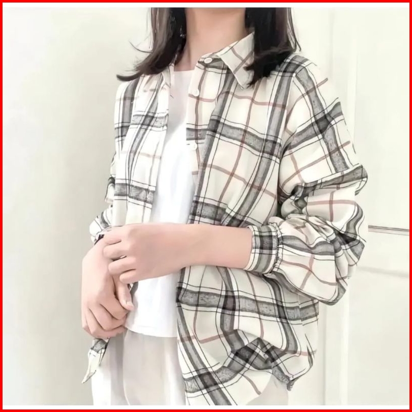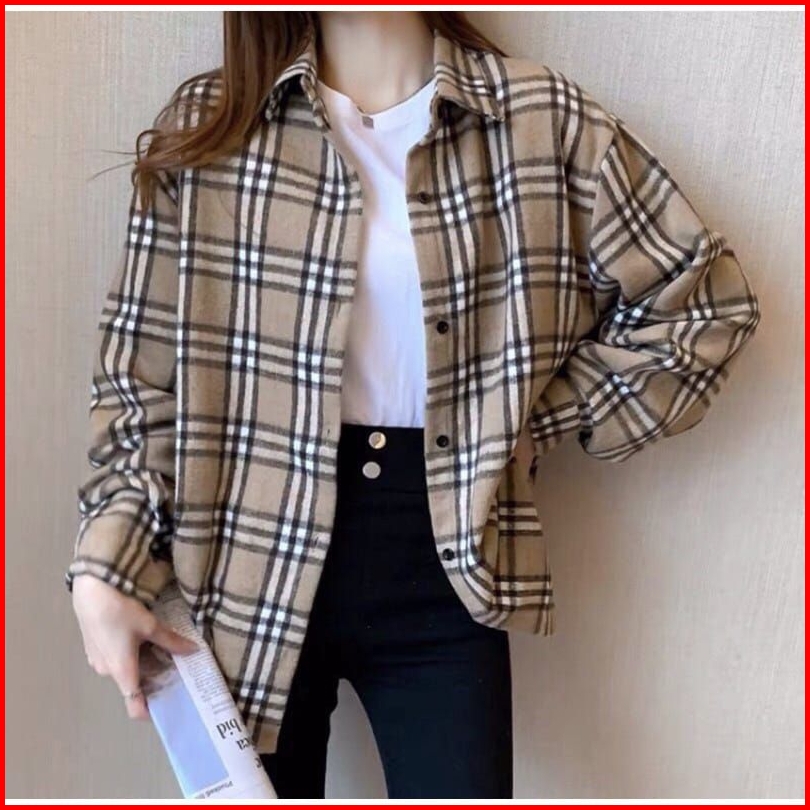 Kemeja Flanel Wanita Lengan Panjang Motif Kotak Kotak Oversize Kemeja Wanita