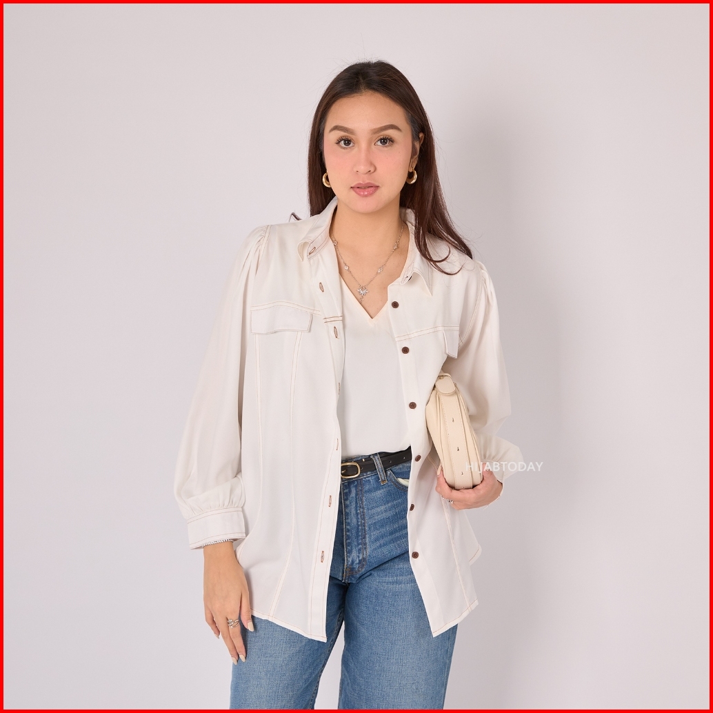 Haila Shirt - Kemeja Wanita Premium Lengan Panjang Details Contrast Stitching With Adjustable Waist - Bisa Sampai Big Si