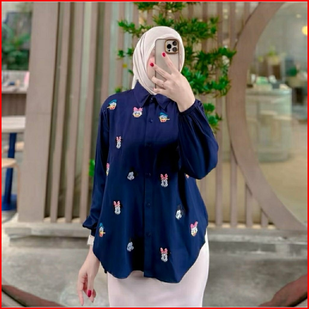 Kemeja Mickey Atasan Wanita Bordir Lucu Rayon Twill Polos Premium