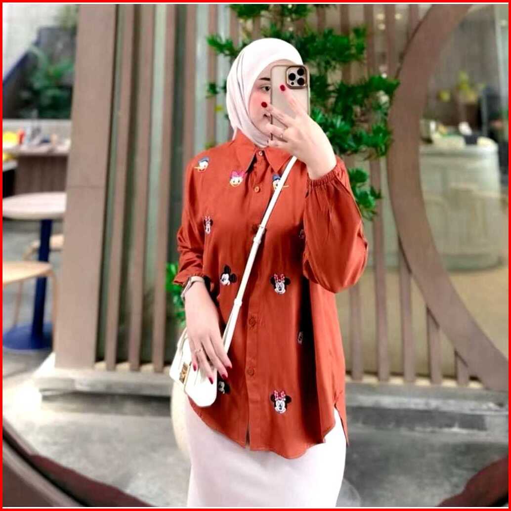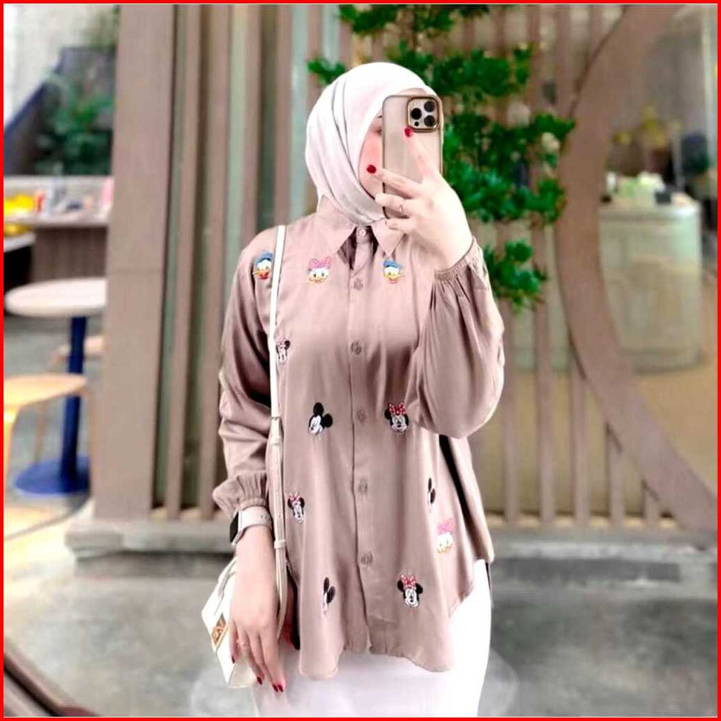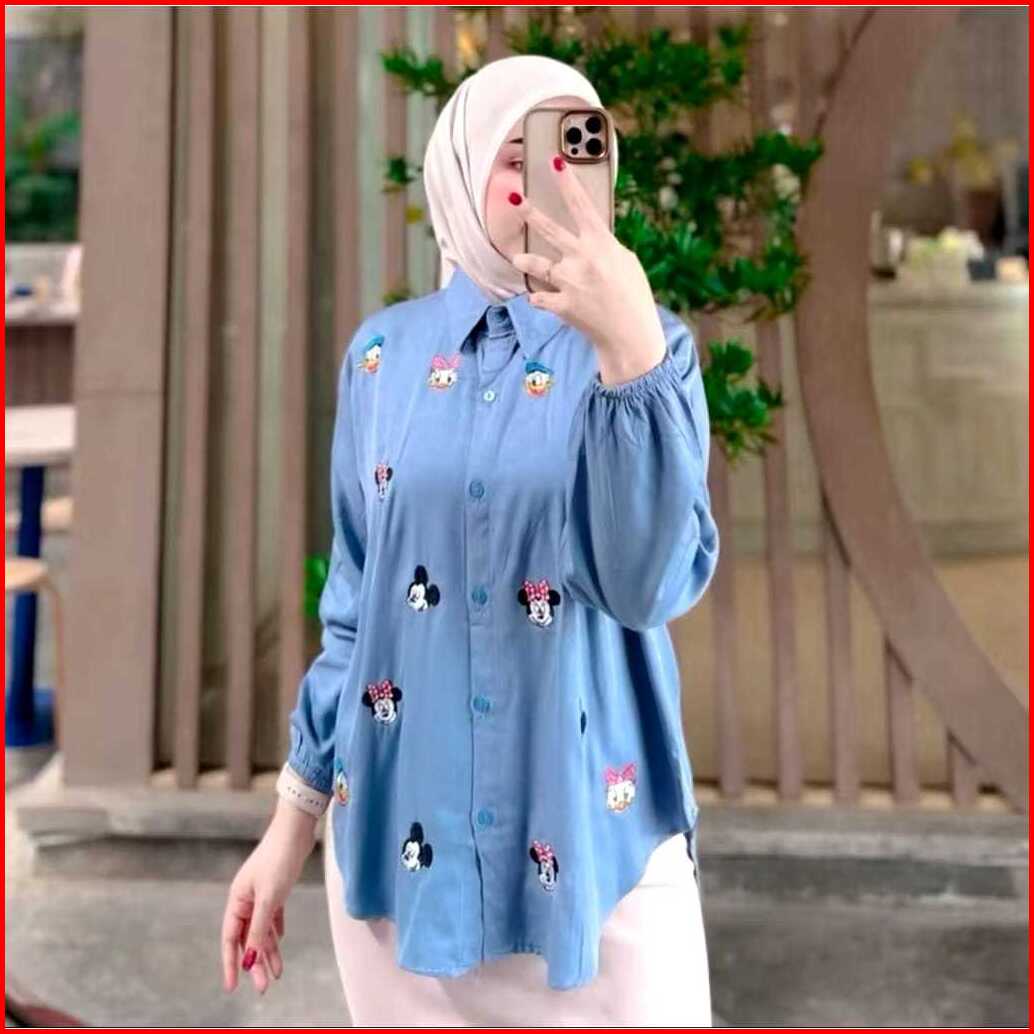 Kemeja Mickey Atasan Wanita Bordir Lucu Rayon Twill Polos Premium