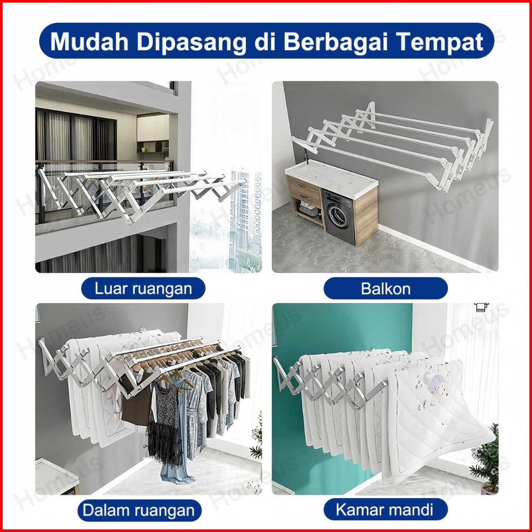 Homeus Jemuran Baju Dinding Stainless Steel Pakaian 3 4 5 Tiang Single Jemuran Lipat Stainless Steel Rak Jemuran 100-200