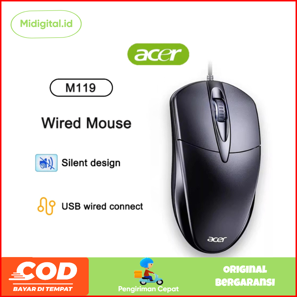 Mouse Kabel Silent Acer M119 Cocok Untuk Desktop Laptop Mice Wired - 100 Original