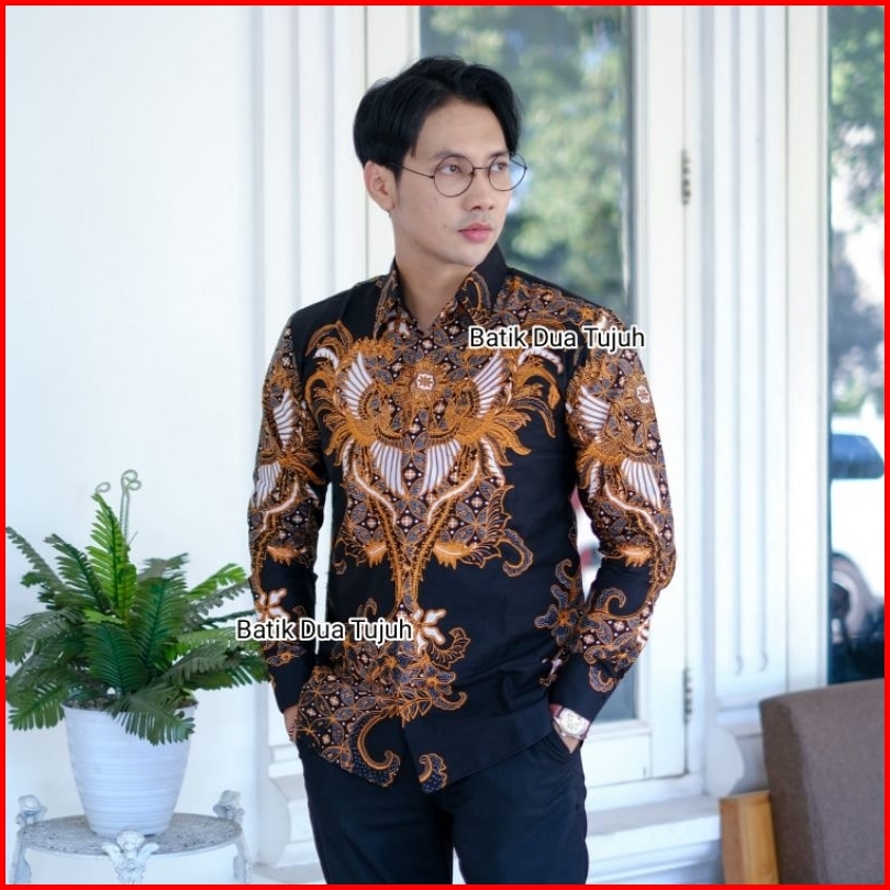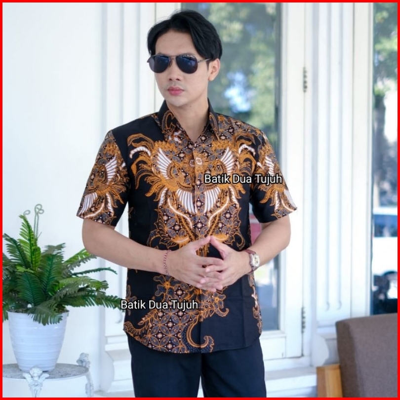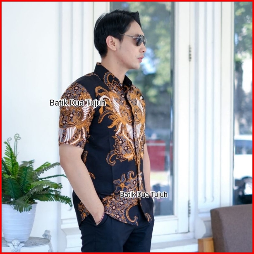 Atasan Baju Hem Kemeja Batik Pria Lengan Pendek Original Slimfit Lapis Furing Nareswara Hitam