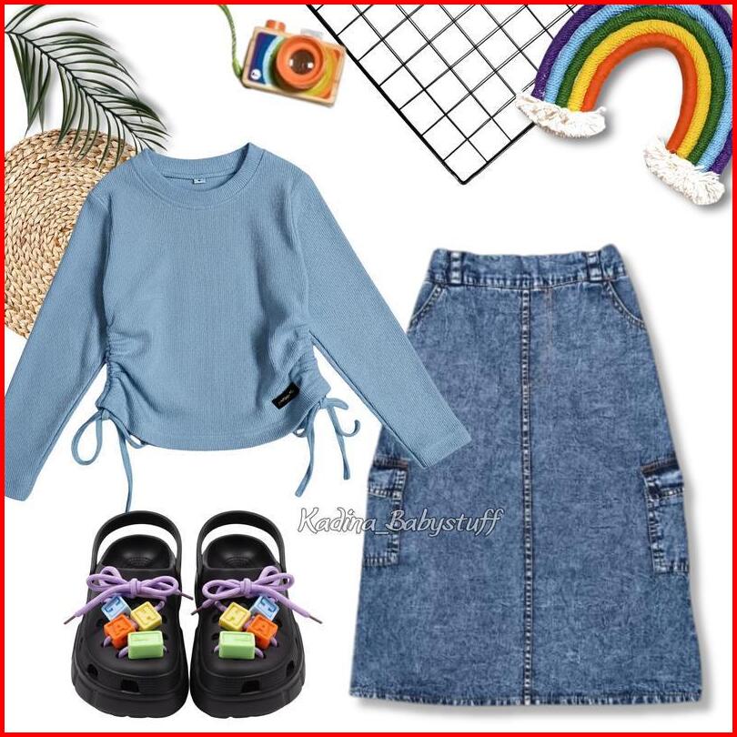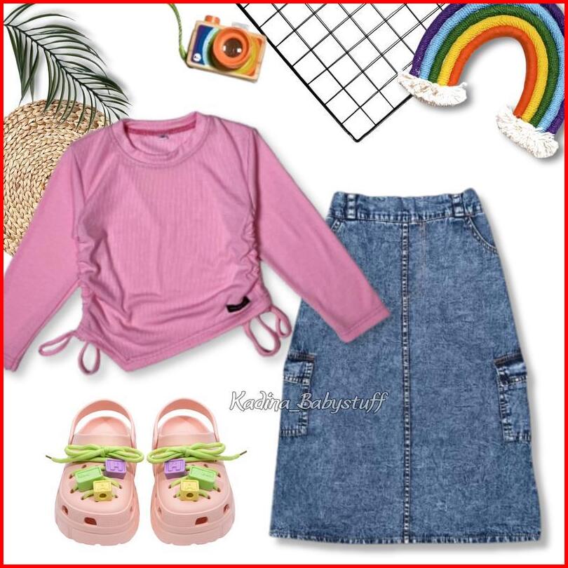 Oneset Free Sandal Rok Cargo Jeans Anak Kekinian Kaos Knit Serut Usia 2-12 Tahun Setelan Rok Anak Perempuan