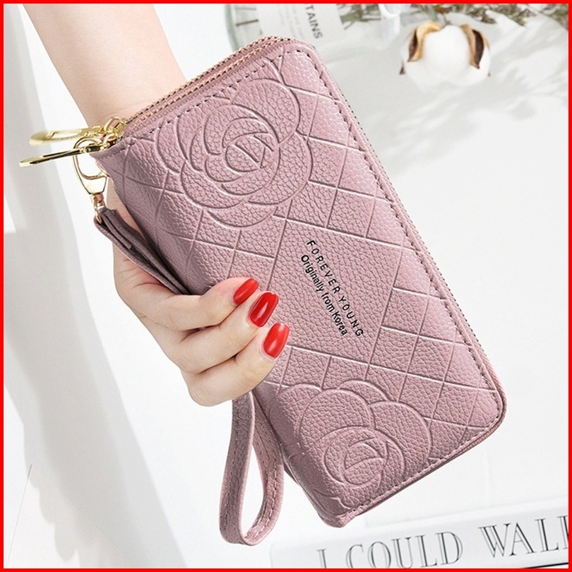Dompet Panjang Wanita 2 Resleting Premium Pesta Kulit Pink Bunga Portale Wa477p3 Muat Hp Tali Pendek Slot Kartu Uang Koi