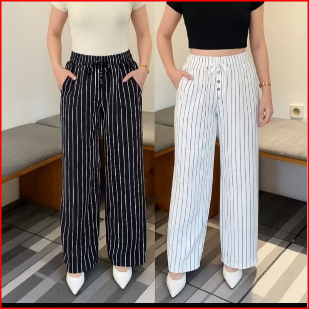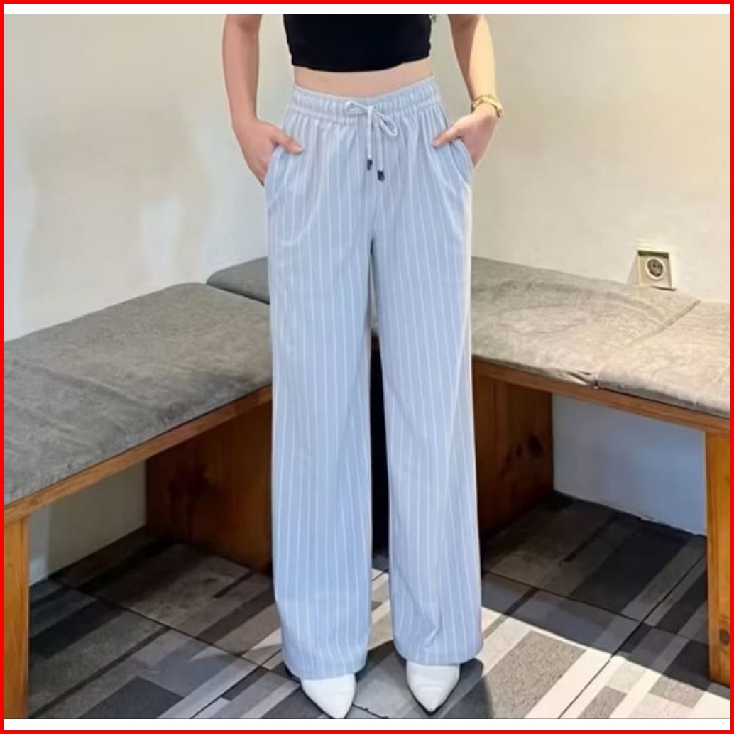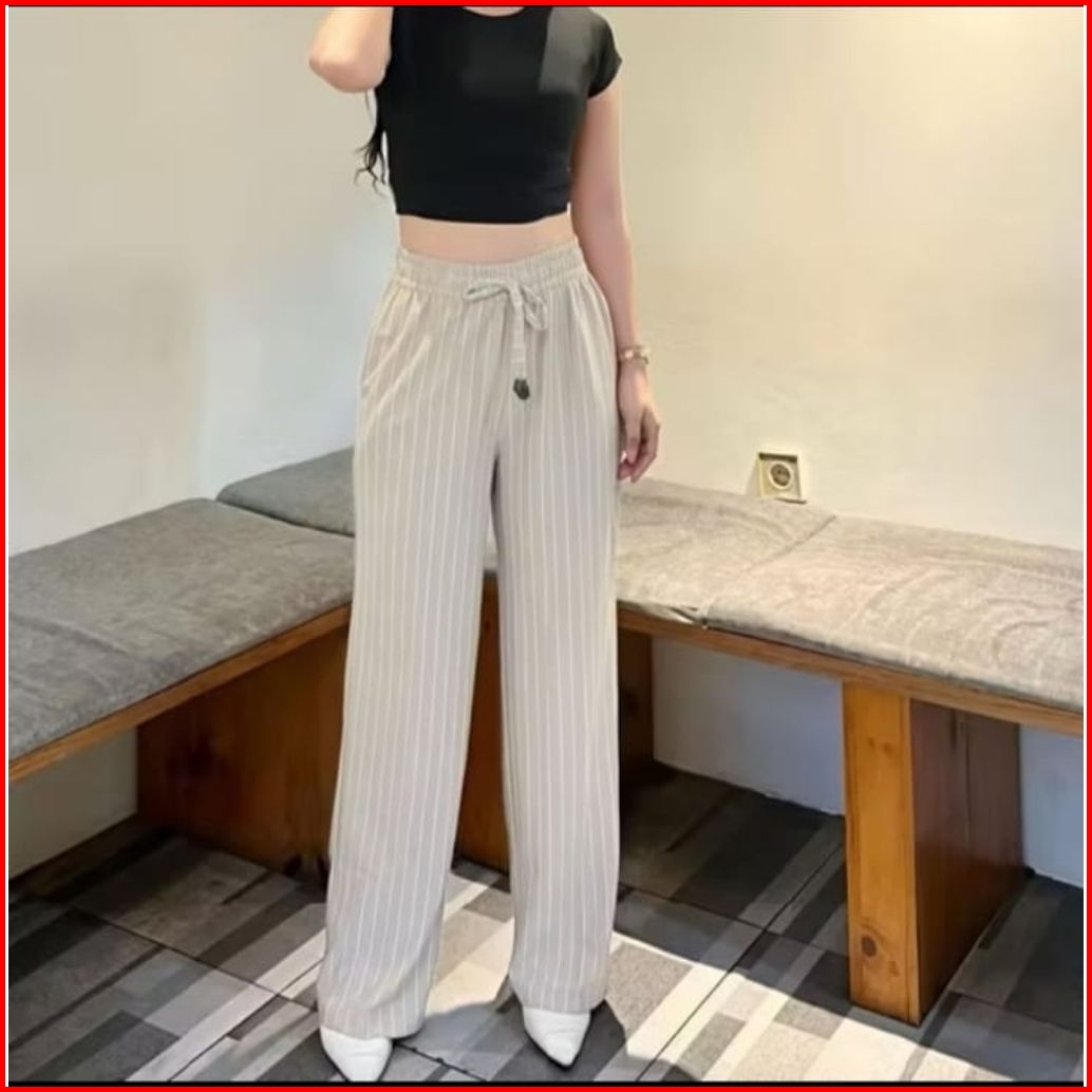 Celana Wanita Everday Kenit Bangkok Strip Kulot Panjang Motif Garis Baggy Kantor