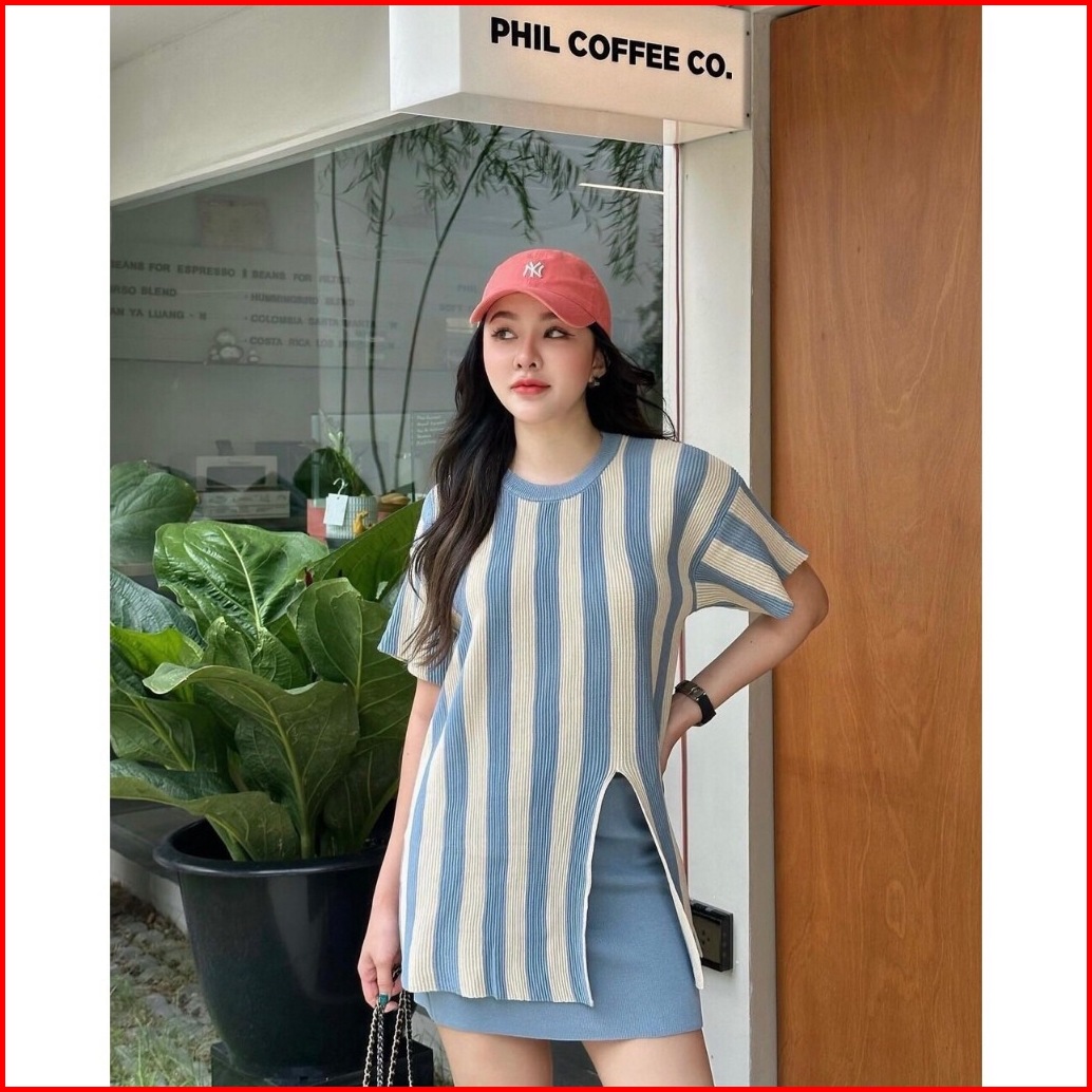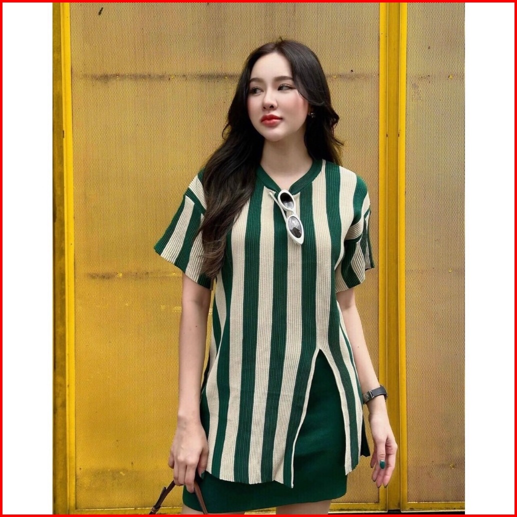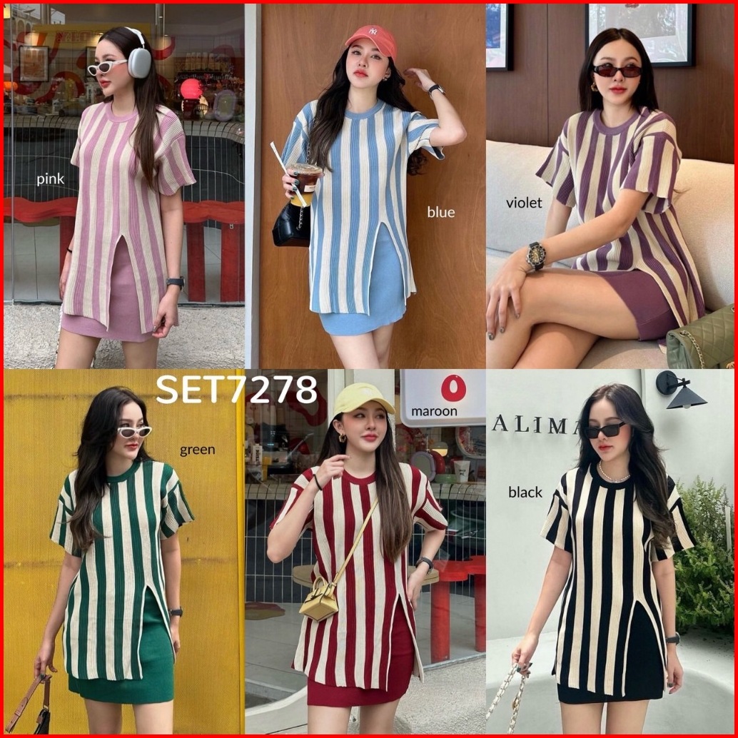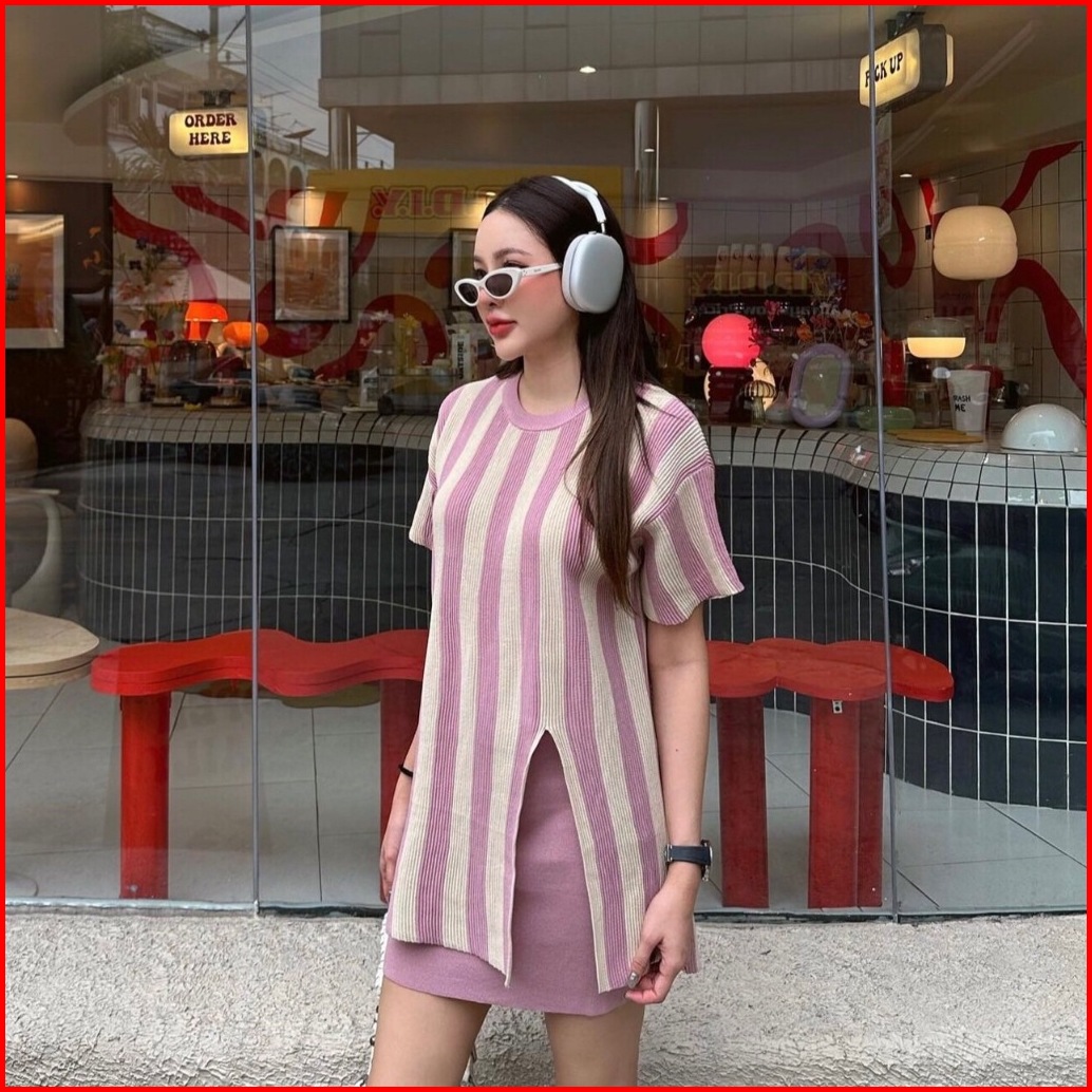 Fg Joy Striped Slit Long Top W Skirt Knit Set Setelan Rajut Wanita Nyaman Set7278