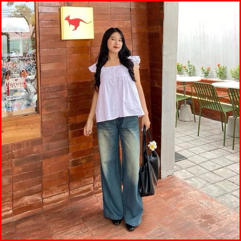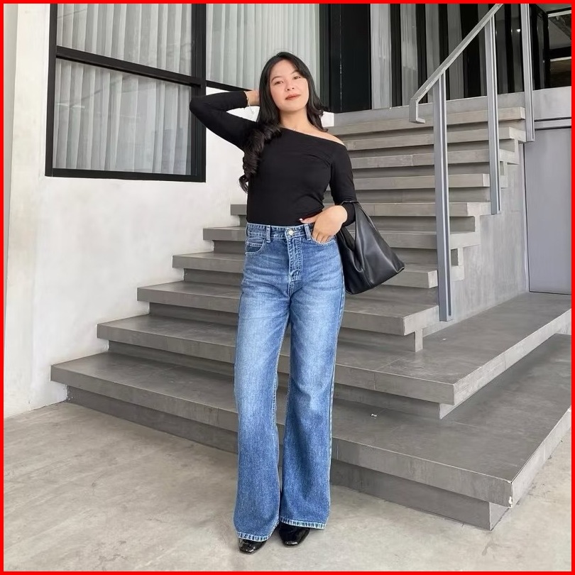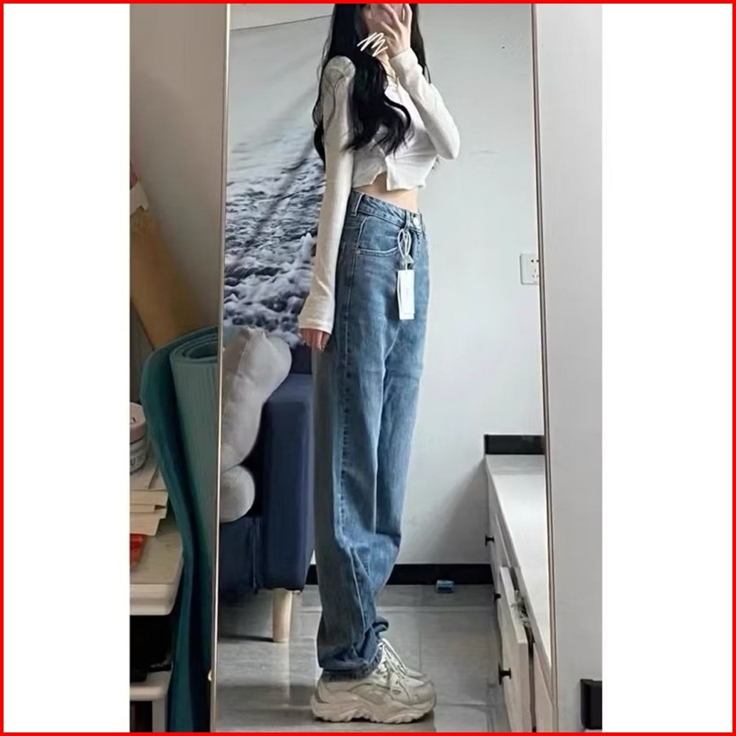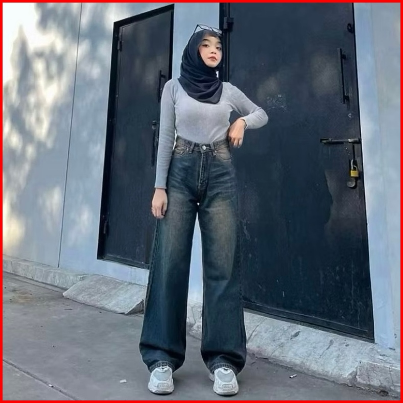 Celana Jeans High Waist Wanita Korean Style Jeans Baggy Pants Serbaguna Kasual Biru Retro 27-42