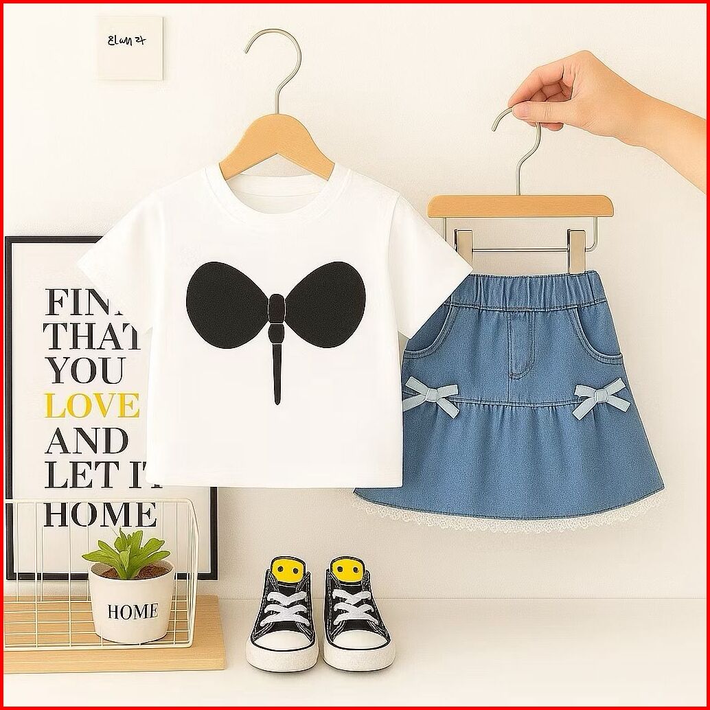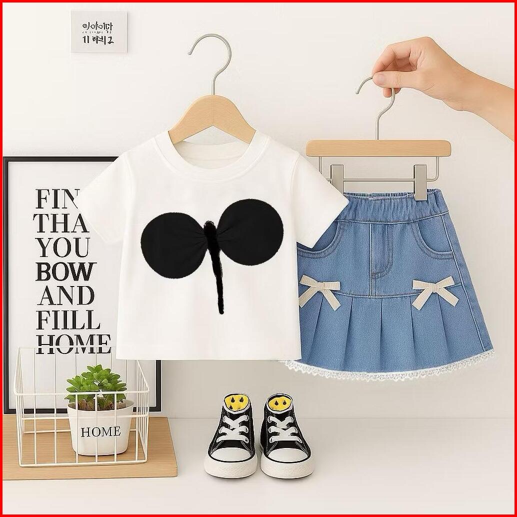 Setelan Anak Perempuan Kaos Lengan Pendek Motif Pita Rok Jeans Renda Imut Outfit Anak Cewek Kekinian Usia 1-5 Tahun