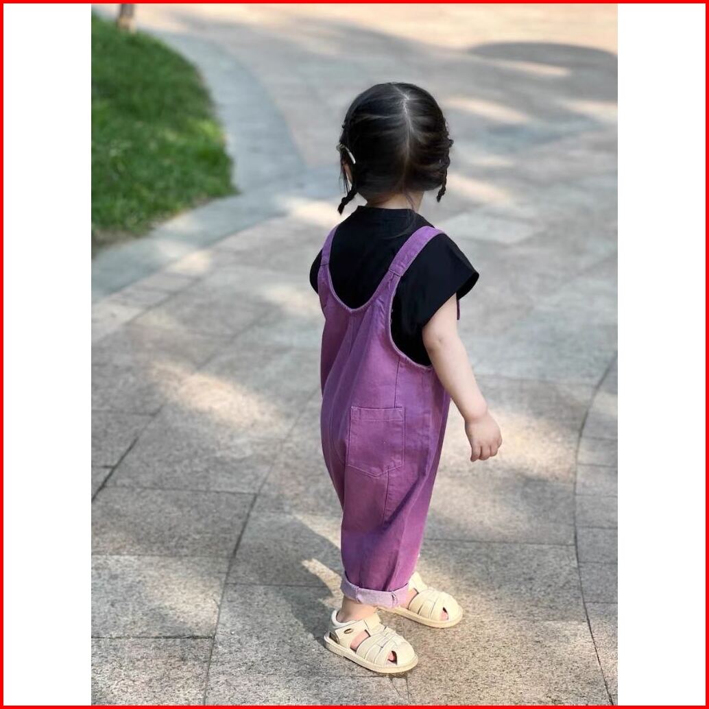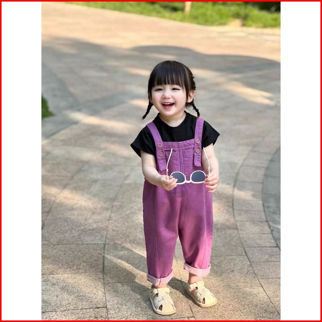 Korea Style Setelan Anak Perempuan Jumpsuit Jeans Anak Perempuan Lengan Pendek Hitam T-shirt Celana Ungu Jeans Kaki Leba
