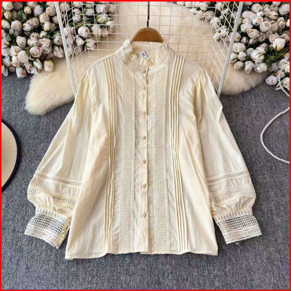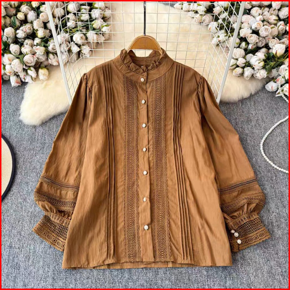 Atasan Kemeja Kerah Tinggi Lengan Panjang Muslimah Gaya Ruffle Klasik Warna Khaki Apricot Hitam Busana Elegant Original