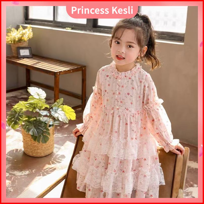 Princess Kesli Store 2-11 Tahun Rok Sifon A-line Bunga Kecil Lengan Panjang Anak-anak Musim Semi Gaya Baru Untuk Anak-an