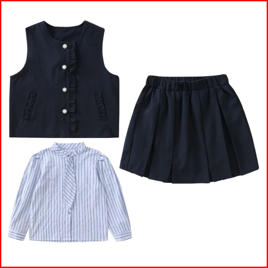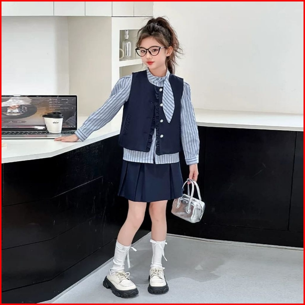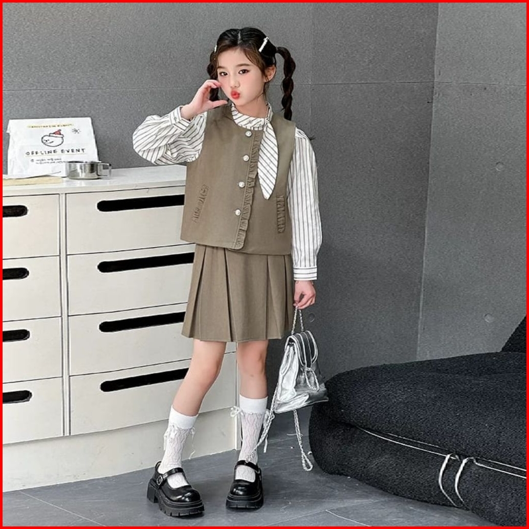 Dma-033 Setelan Baju Rok 3in1 Anak Perempuan Import Usia 7-12 Tahun Setelan Baju Atasan Kemeja Lengan Panjang Rompi Vest