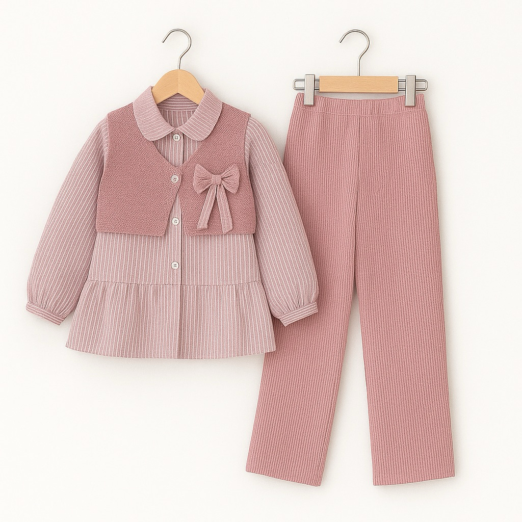 Setelan Anak Perempuan Terbaru 2025 Lengan Panjang Usia 4-15 Tahun Bahan Knit Mix Salur Terbaru Kekinian Fashion
