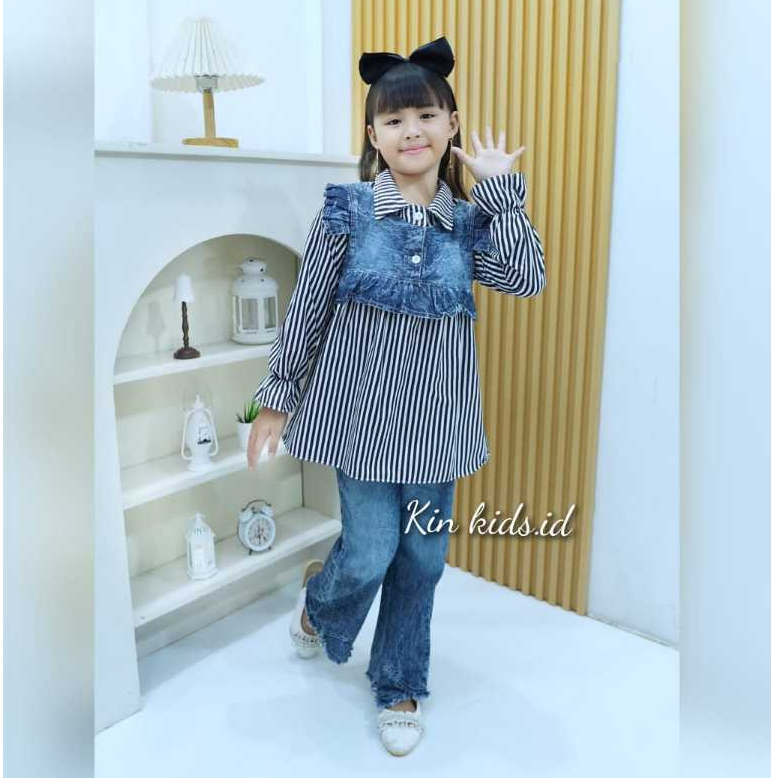 Baju Setelan Anak Perempuan Salur Celana Jeans Cutbray Baju Kemeja Salur Usia 3-9 Tahun- Kin_Kids.Id