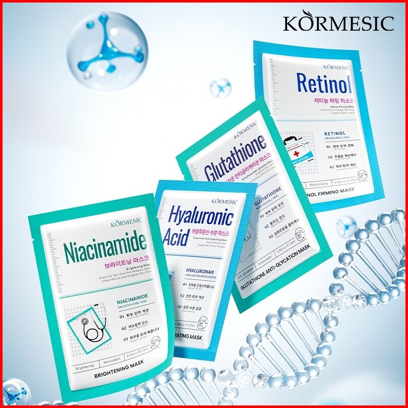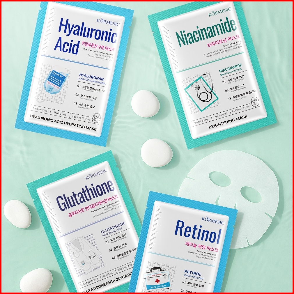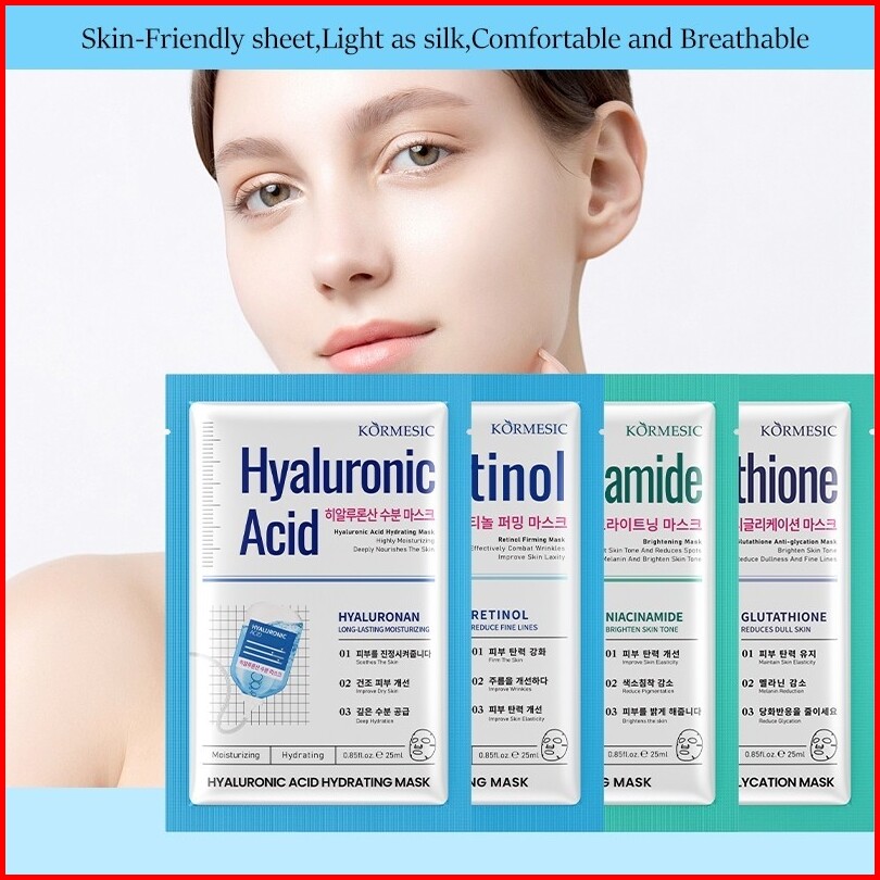 New Launch Kormesic Sheet Mask 24 Pcs Hyaluronic Acid Hydrating Niacinamide Brightening Glutathione Glowing Retinol Anti