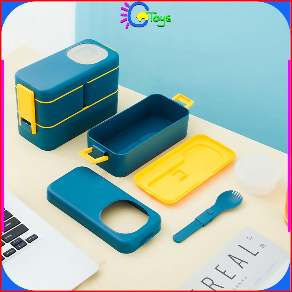 Cr-c779 Kotak Makan 2 Tingkat Portable 1050ml Ada Sauce Cup Lunch Box 2 Layer Rantang Makanan Set Anti Tumpah