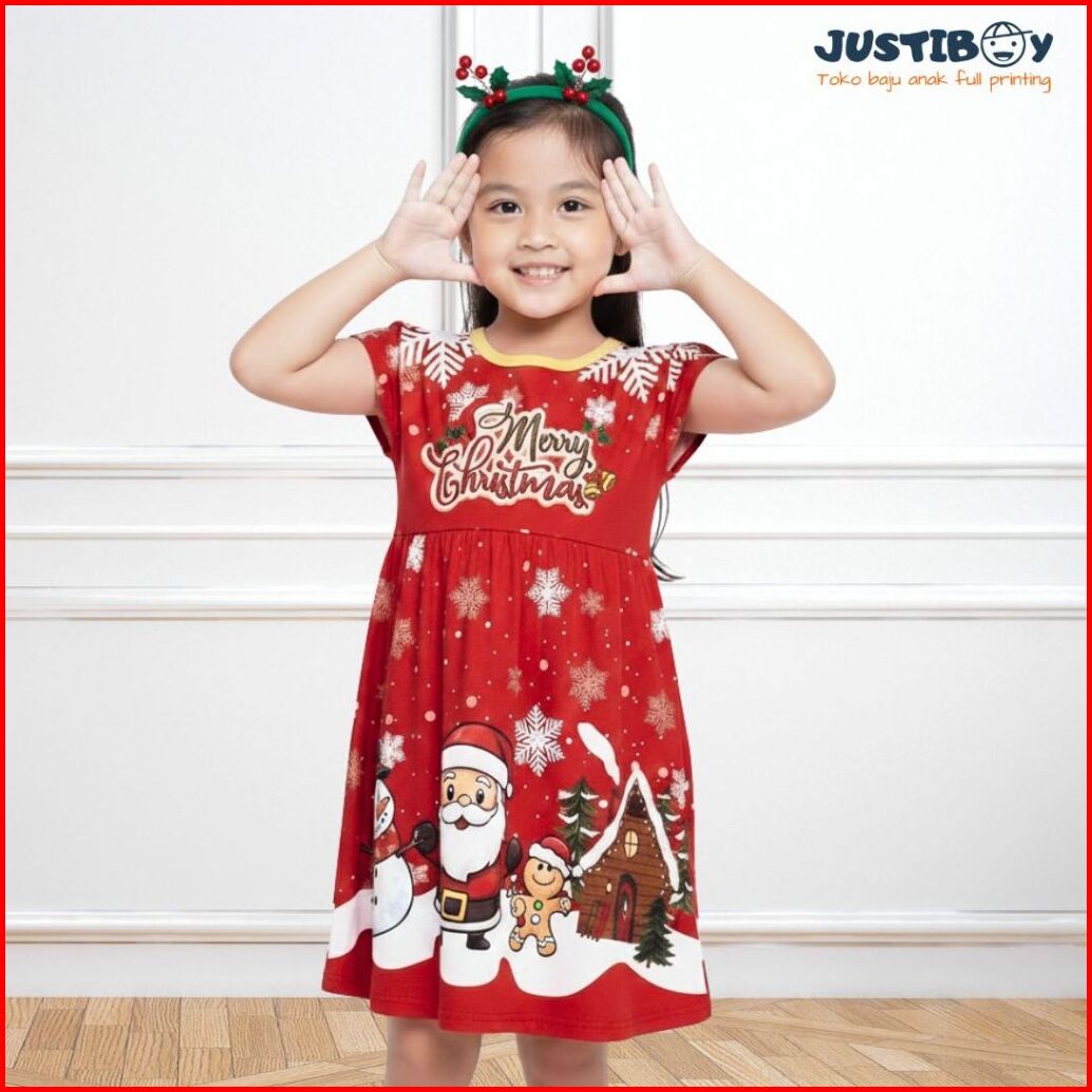 Dress Anak Perempuan Natal Lengan Pendek Daster Anak Cewe Merry Christmas Umur 3 - 9 Tahun Abel