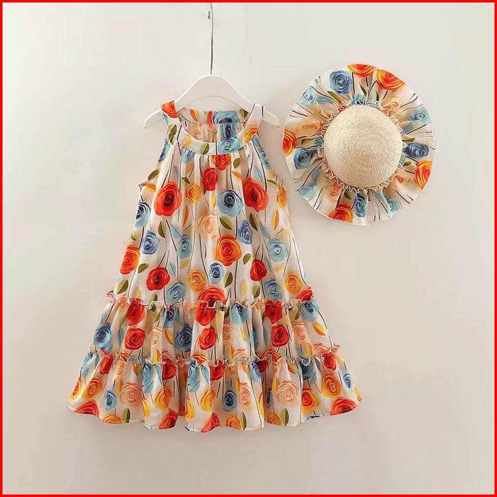 363793 - Gaun Floral Dapat Topi Baju Dress Pantai Tanpa Lengan Fashion Anak Perempuan Cewek Bunga - Motif Rose Flower