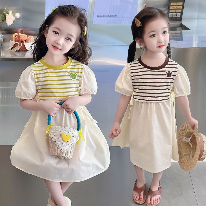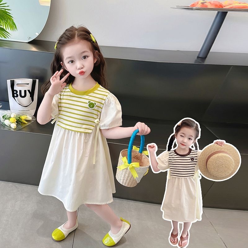 1-9 Tahun Gaun Anak Perempuan Rok Belang Pearl Princess Bahan Katun Lembut Dress Gaya Baru 2025