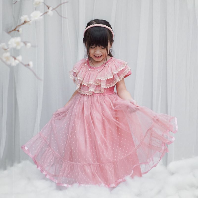 Baju Gaun Anak Perempuan Salsa Dress Renda Tingkat Kombinasi Tile Polkadot Usia 3-10 Tahun