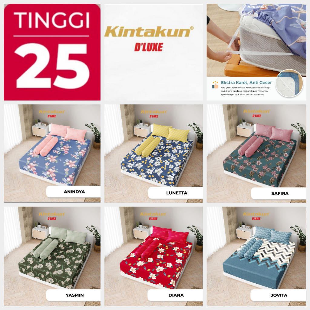 Sprei Kintakun D'luxe Tinggi 25 cm BANTAL 4 Uk.180 x 200 x 25 Ada Double Karet Anti Geser
