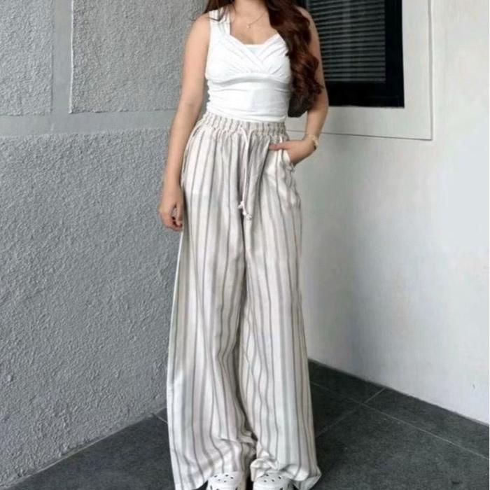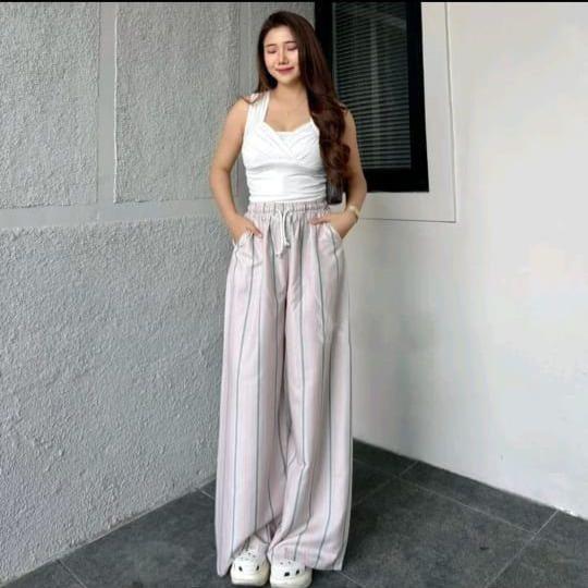 EVERYDAY PANTS - CELANA KULOT PANJANG WANITA BAGGY KANTOR KULIAH MOTIF GARIS CELANA BANGKOK STRIPE PANTS - BLUE, STANDAR