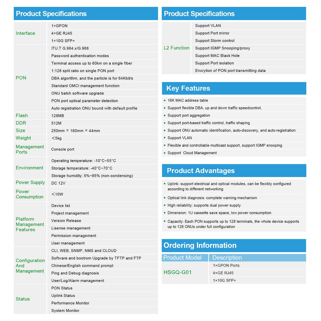 OLT HSGQ-G01ID GPON 1 PORT PON UPLINK 10G AC/DC 12V INCLUDE 1 SFP G01ID