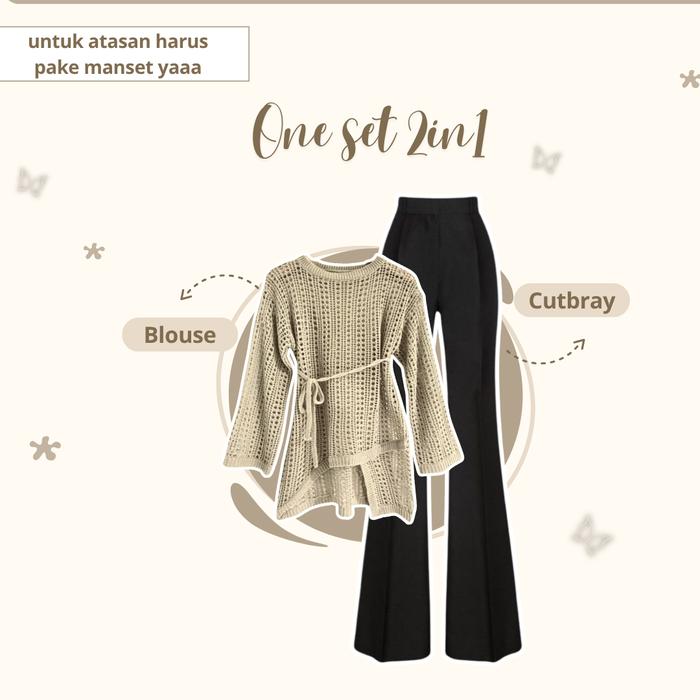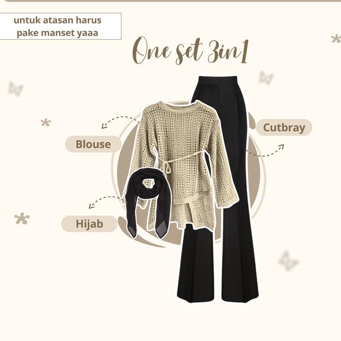 ONE SET SETELAN WANITA 3IN1 OUTFIT STYLE OUTER BLOUSE + CELANA CUTBRAY + HIJAB SEGI EMPAT LM110 - ONE SET 3IN1