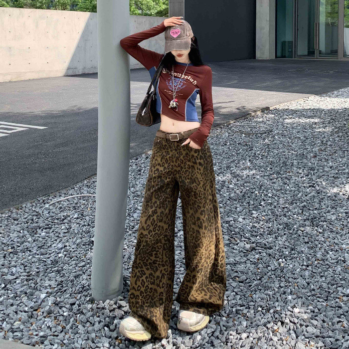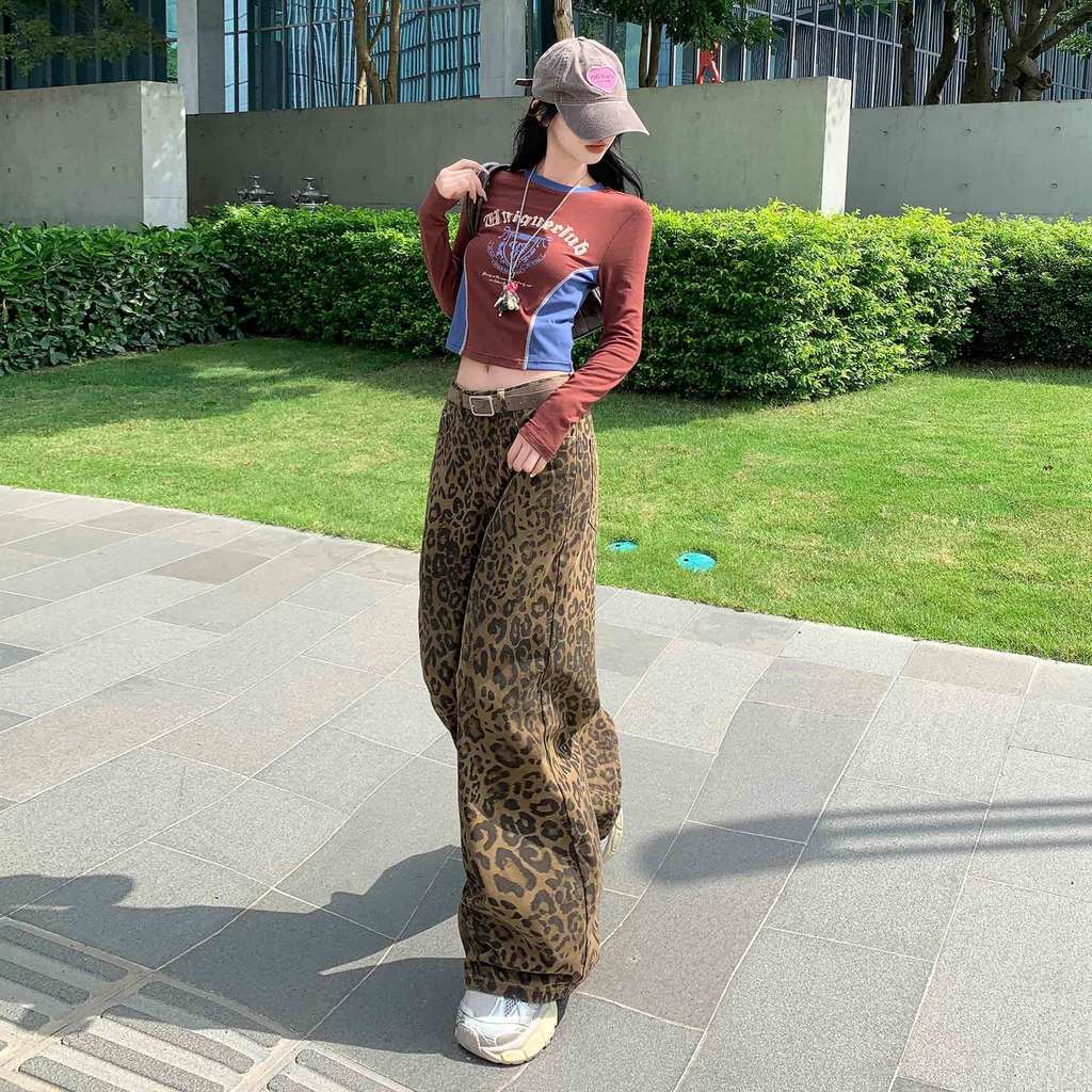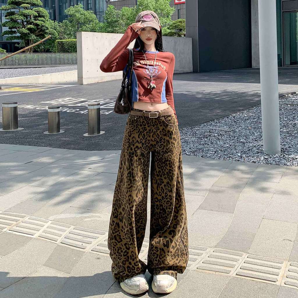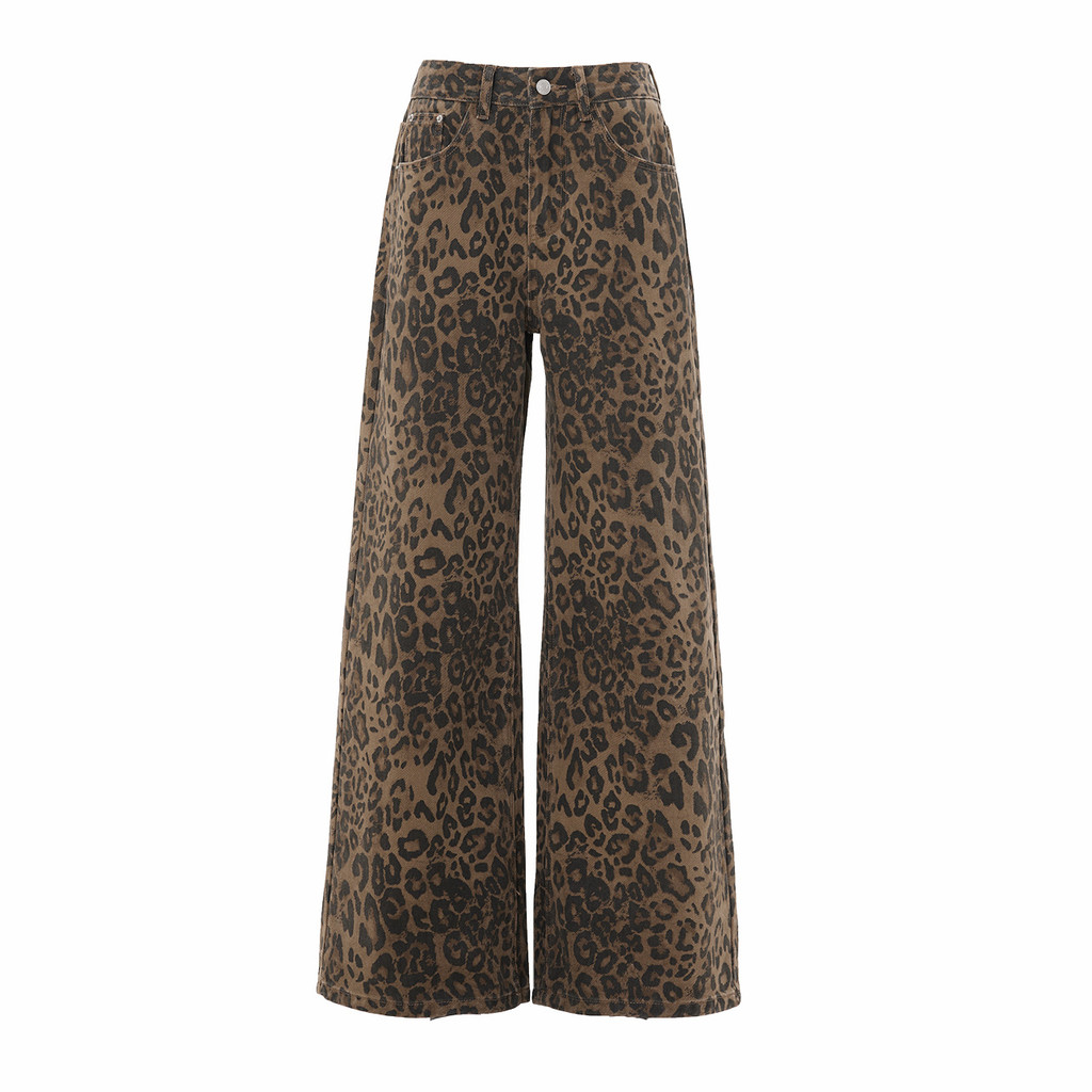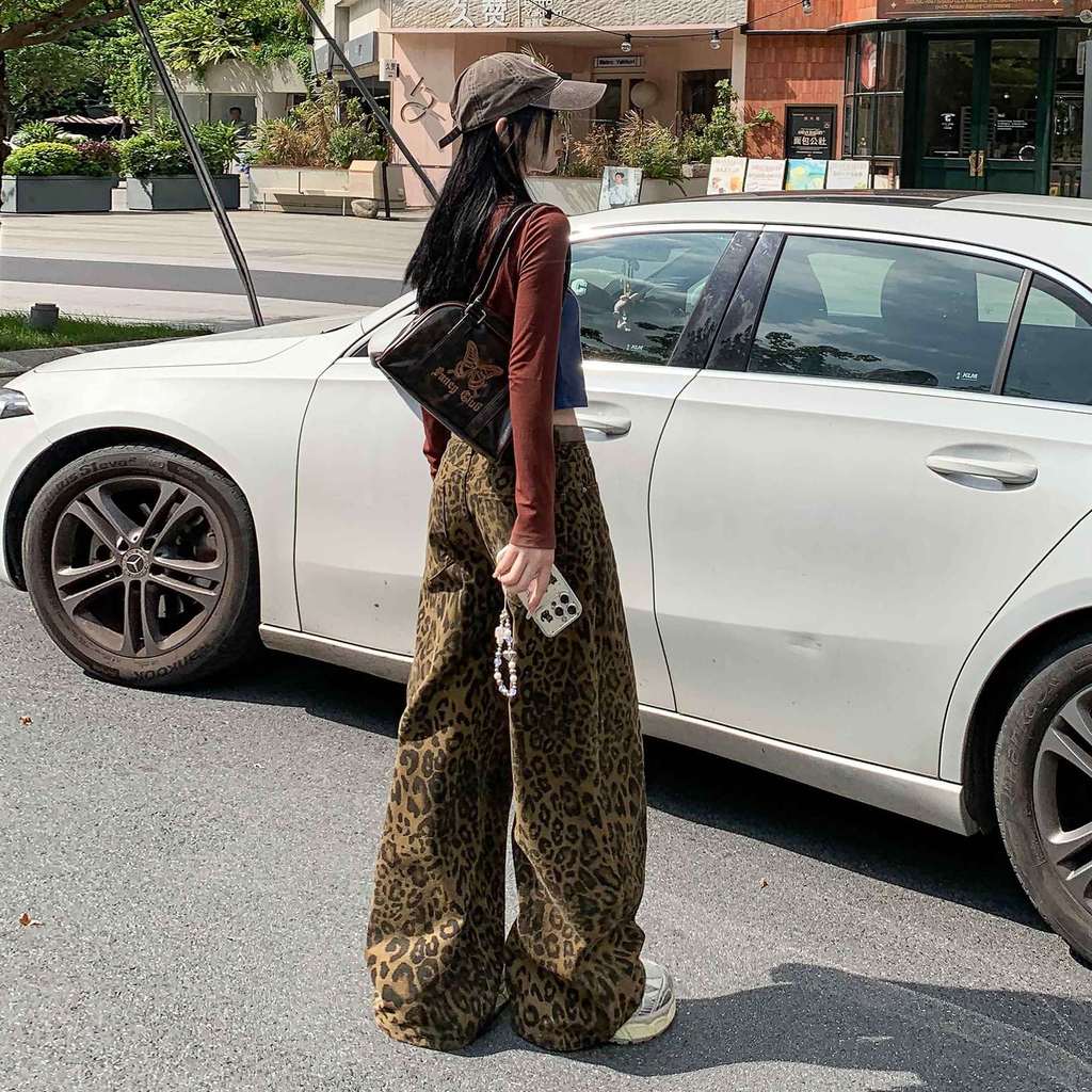 PUWAS S~6XL Jeans Motif Macan Tutul Retro Gaya Amerika Jeans Ramping Kasual Baru Berkaki Lebar Untuk Wanita.